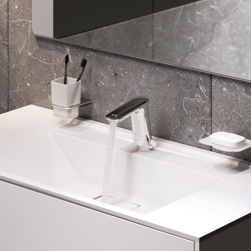 Он отличается также и лаконичным обликом, сочетая в себе многофункциональность. Прямо на нем расположена ручка регулировки температуры, что делает использование смесителя еще проще! Добавляет удобства использования и его универсальность - сенсор и смеситель работают от обычных батареек типа АА, которые легко найти практически в любом магазине.