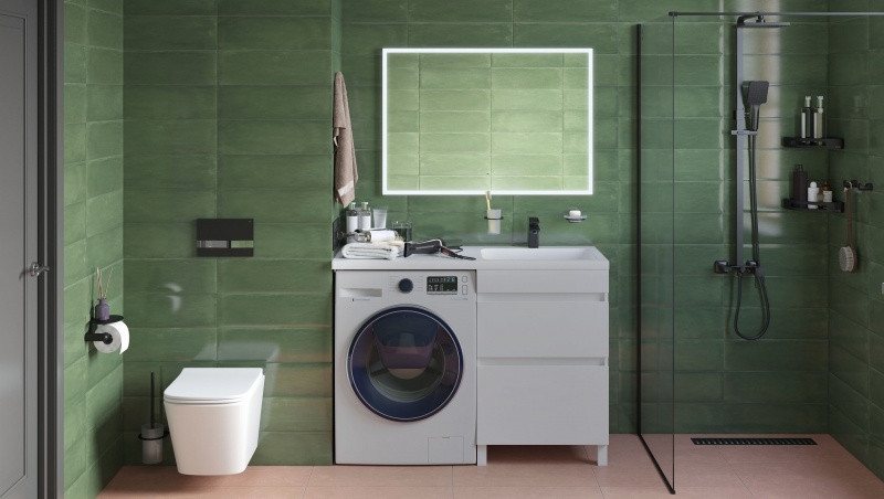 Увлекаясь дизайном ванной комнаты, не стоит забывать о размещении стиральной машины, ведь зачастую, а особенно в новостройках, необходимые инженерные коммуникации выведены для стиральной машины именно в ванной. А так как она занимает довольно много места, стоит задуматься о том, как извлечь пользу от пространства.