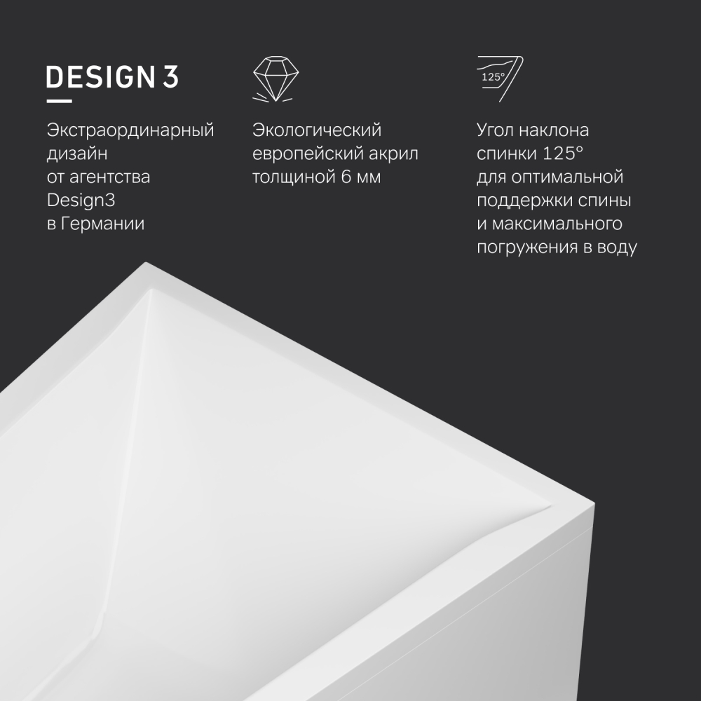 - Сохраняя стандартные габариты, ванна имеет увеличенный внутренний объём, комфортный для человека любой комплектации.