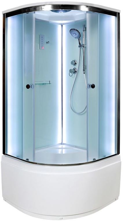 | Оснащение | душевой гарнитур, экран, сифон, смеситель, пульт ДУ, антискользящая вставка из антибактериального цельнолитого полимера, полочка, гибкая подводка |