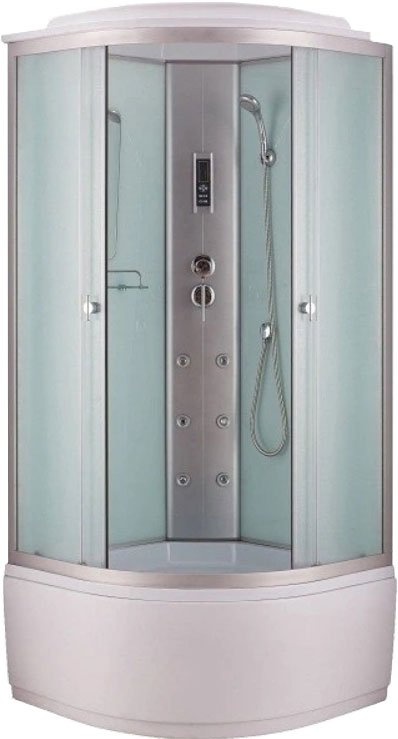 - Комплектуется системой вентиляции, зеркалом, ручным душем, на крыше расположен тропический душ, также дополнительно есть трехрежимный смеситель и сиденье