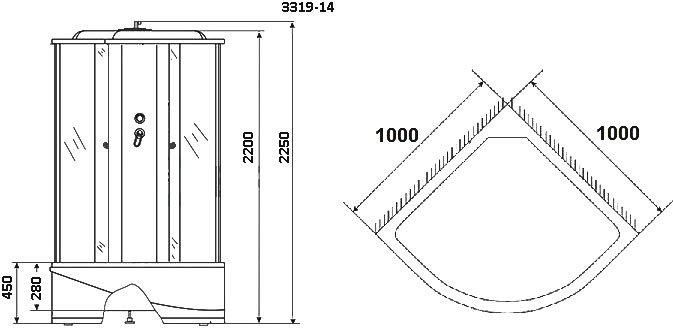 - Душевая кабина Niagara NG-3319-14 имеет форму четверть круга и устанавливается в угол помещения
