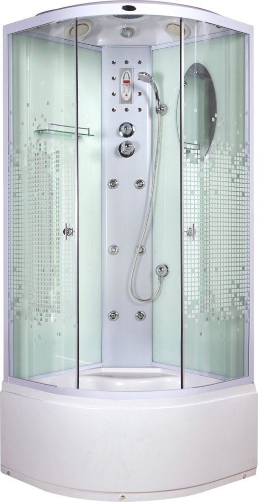 - Поддон в форме четверти круга оснащен сиденьем и съемным экраном