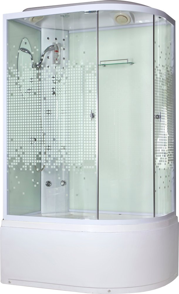 - К преимуществам можно отнести большое внутреннее пространство, глубокий поддон, который можно наполнять водой, и узор на стеклах для создания приватной обстановки