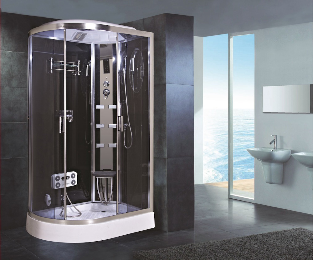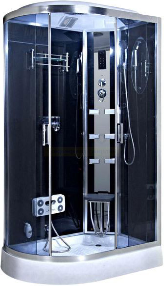 - Задние стенки изготовлены из каленного стекла 5 мм тонированного цвета, не прозрачные. На правой стенке установлены аксессуары: Штанга с дополнительной лейкой 3 режима переключения, зеркало. На левой стенке полотенце держатель и 2 контейнера под жидкие средства, так же массаж ног