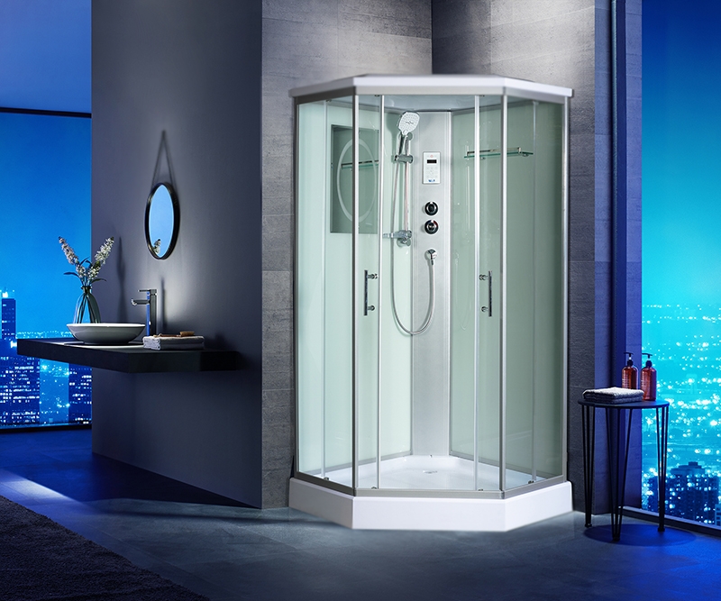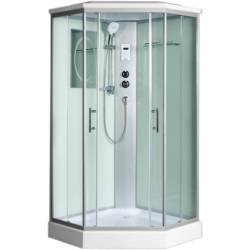 Стеклянная душевая кабина WeltWasser WW500 Nesse 903 90x90 в форме призмы, с двумя раздвижными дверьми, с крышей. Термостатический смеситель. Сенсорное управление. Вентиляция. LED верхний свет. Радио. Подключение к аудио: Bluetooth. Безсиликоновая сборка.