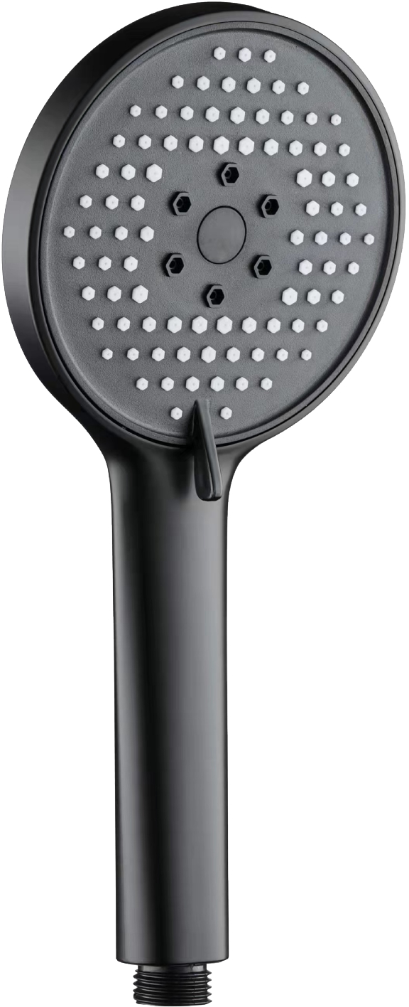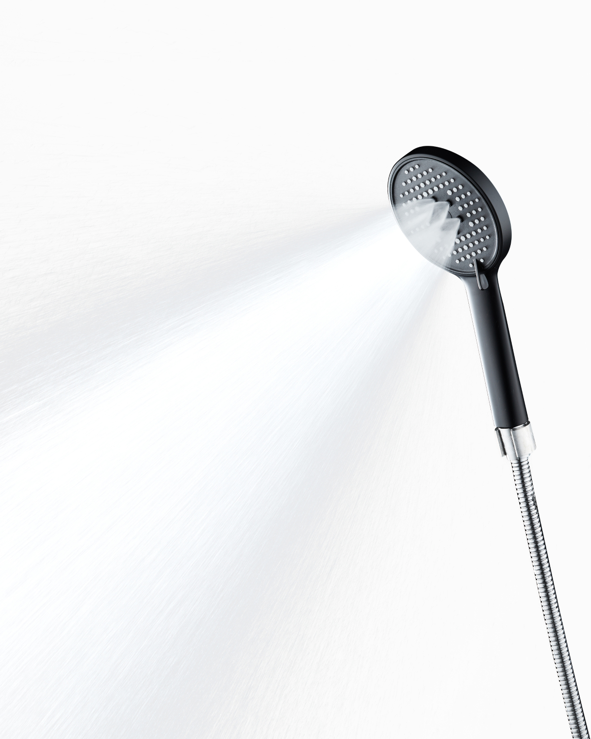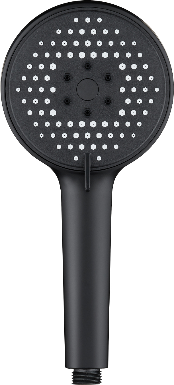 Ручной душ (d 115 мм) - три режима струи. Форсунки с функцией легкого очищения от известкового налета. Система AIR IN обеспечивает увеличенный напор и вместе с тем сокращает расход воды. Материал ABS-пластик. Цвет матовый черный.