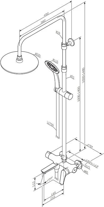 | Оснащение | переключатель потоков, душевая лейка, держатель для душа, кронштейн для верхнего душа, эксцентрики, смеситель, шланг для душа, верхний душ, излив |