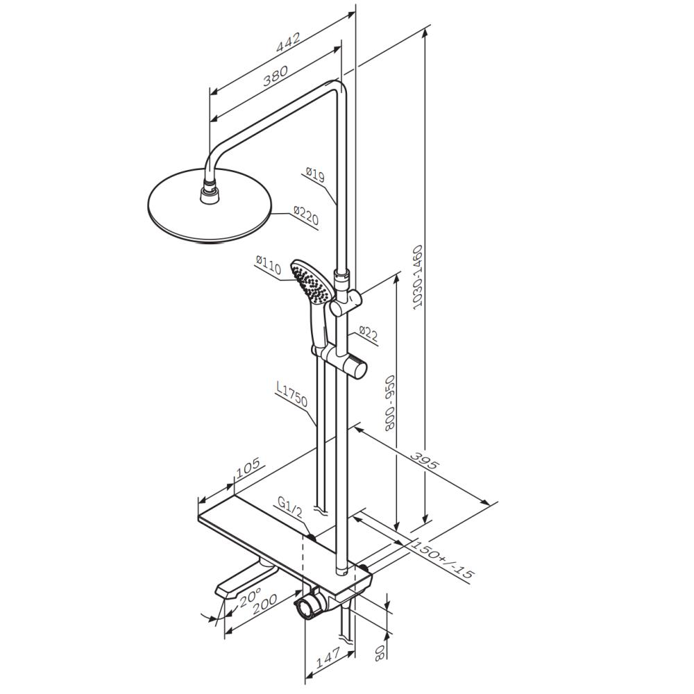 - Продуманные детали для максимального удобства использования: телескопическая штанга регулируется по высоте в диапазоне от 1030 до 1460 мм, обеспечивая комфорт для людей любого роста, душевой шланг 1750 мм с защитой от перекручивания, увеличенный верхний душ диаметром 220 мм, ручной душ диаметром 120 мм.