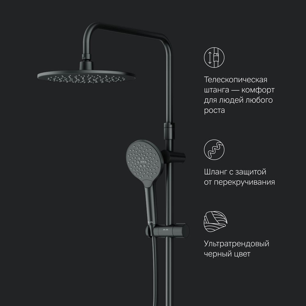 - Премиальные размеры и продуманные детали: увеличенный диаметр душевых леек (верхний душ 220 мм и ручной душ 120 мм) позволит ощутить преимущества тропического душа, тогда как увеличенная длина шланга 1750 мм обеспечит свободу движений во время принятия душа.