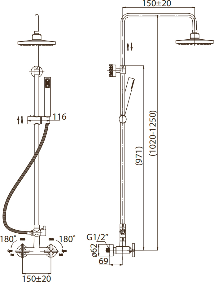 Верхний душ: круглый, D 20 см, регулировка высоты.