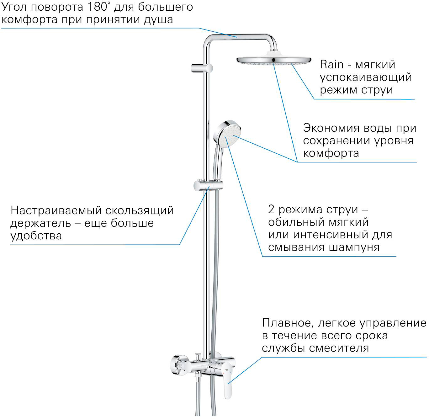| Оснащение | переключатель потоков, душевая лейка, держатель для душа, шланг для душа |