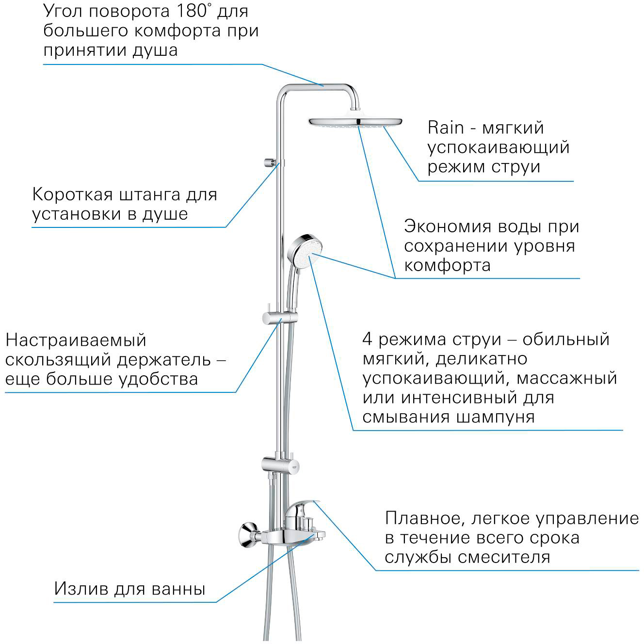 | Оснащение | переключатель потоков, душевая лейка, держатель для душа, шланг для душа |