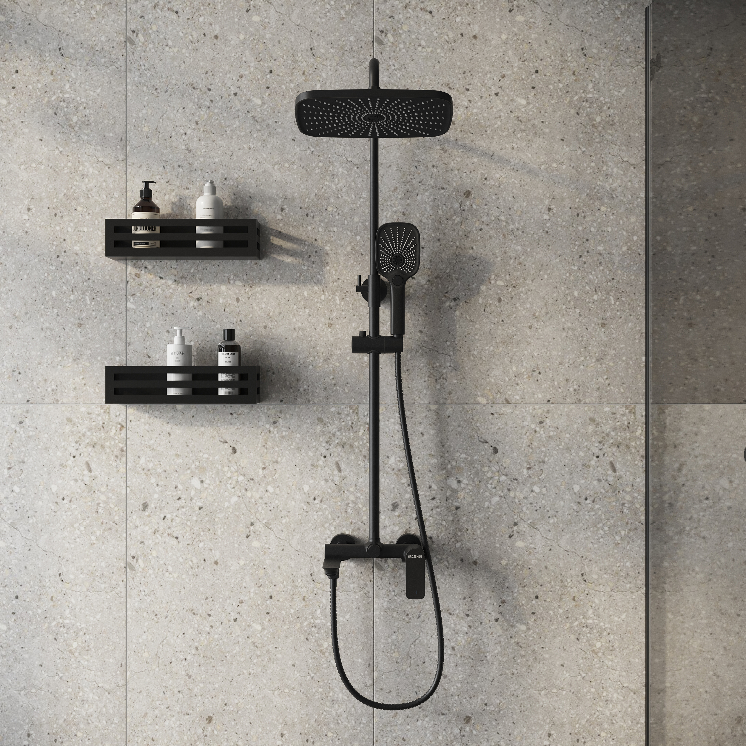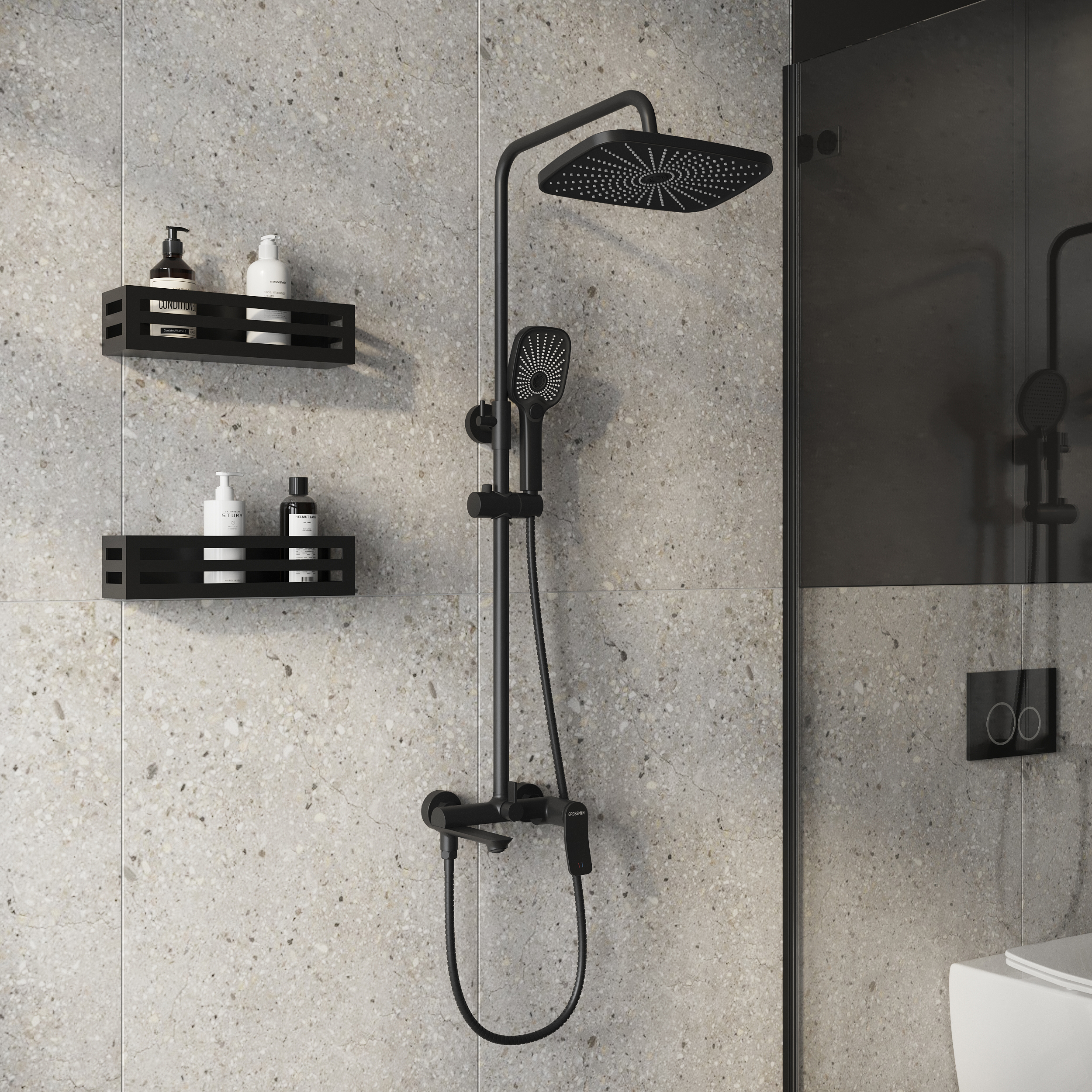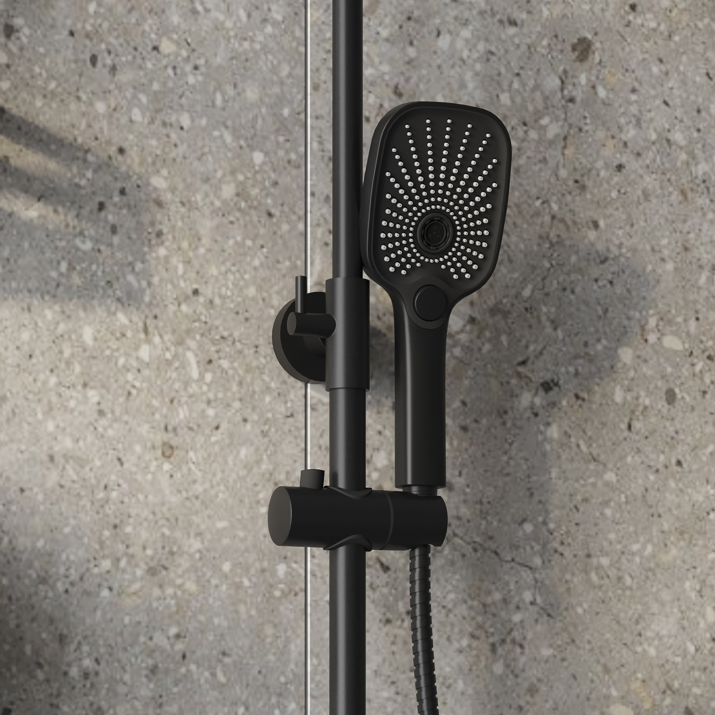 - Телескопическая душевая стойка позволяет изменять высоту до 165 см, что делает использование комфортным для людей разного роста