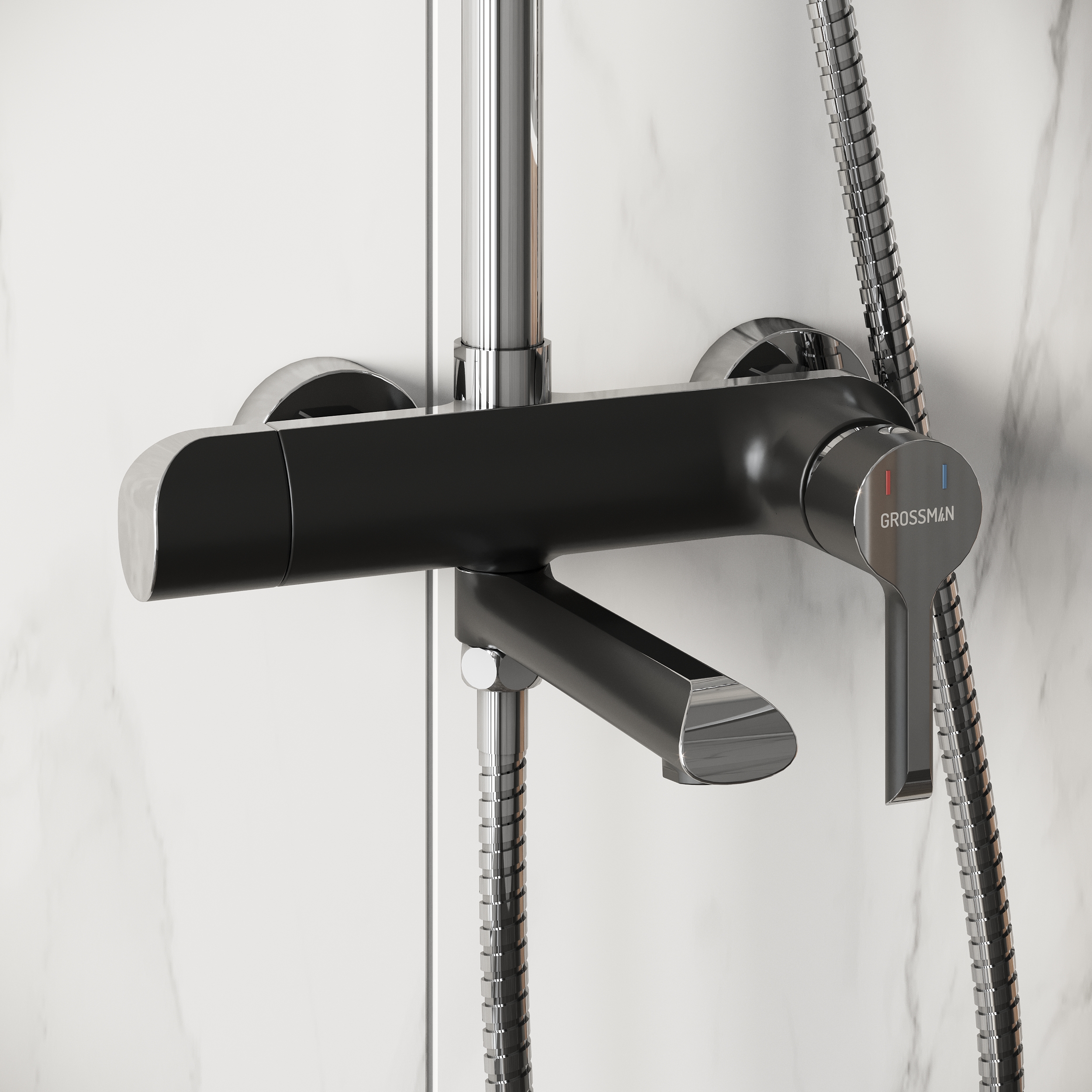 - Телескопическая душевая стойка позволяет изменять высоту до 165 см, что делает использование комфортным для людей разного роста