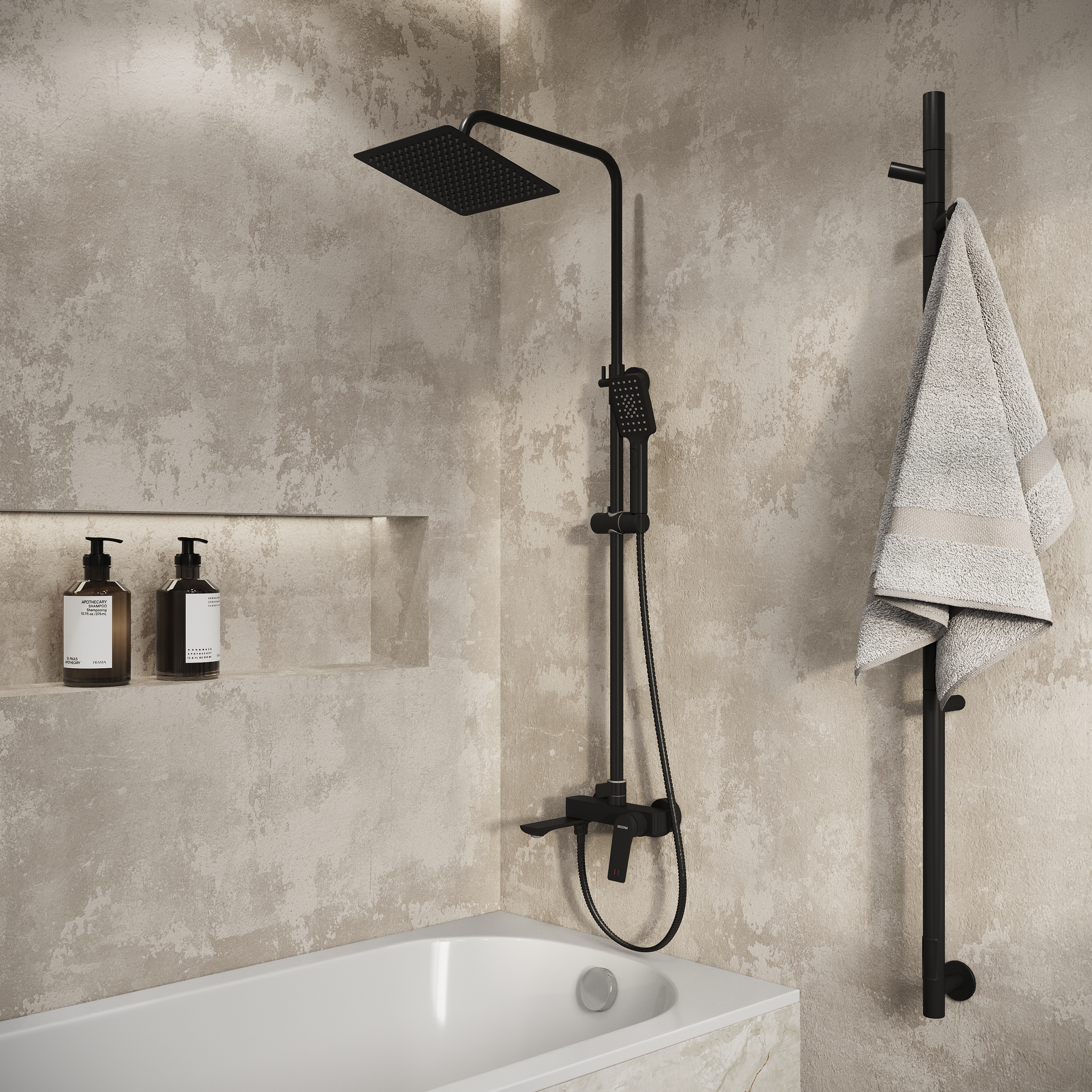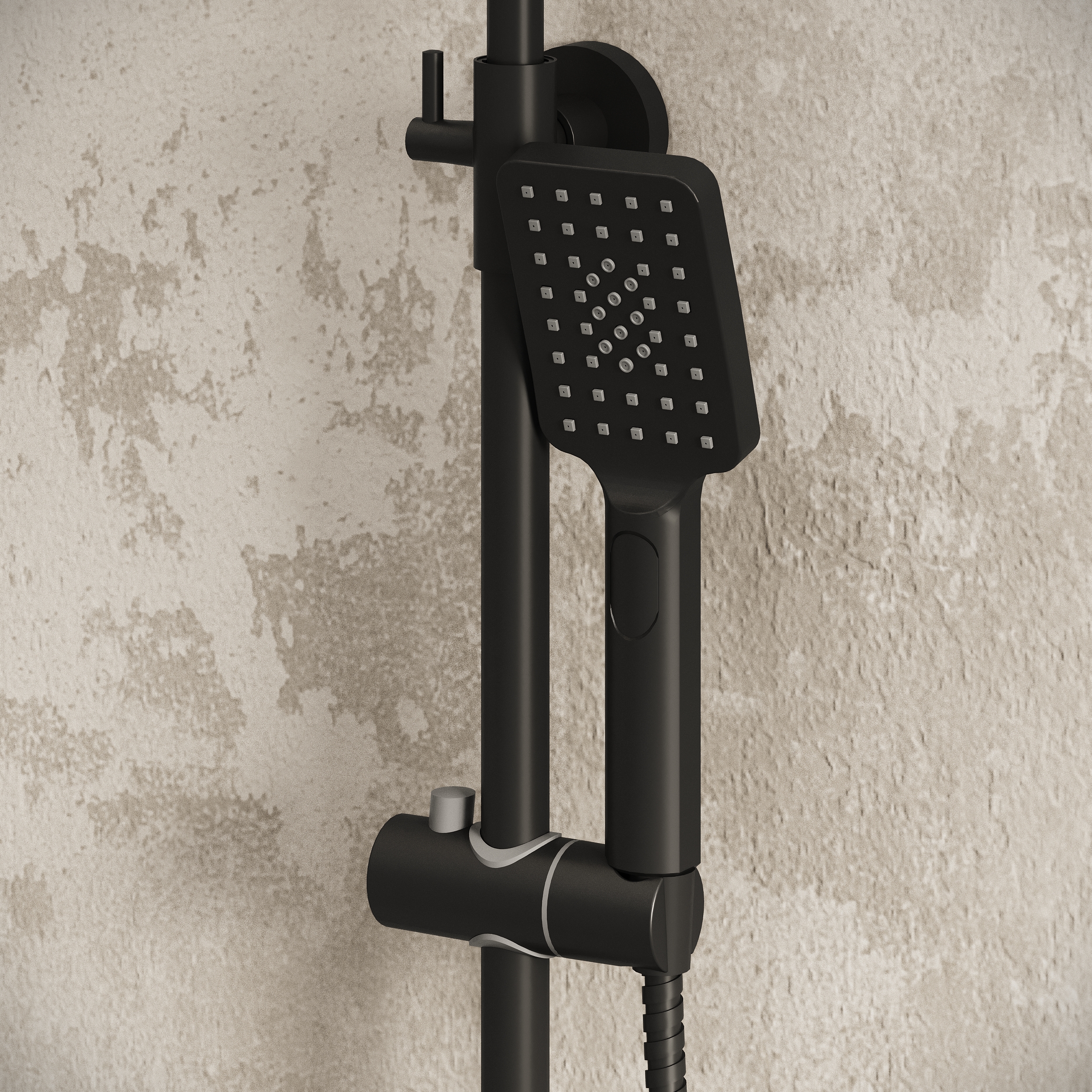 - Телескопическая душевая стойка позволяет изменять высоту до 165 см, что делает использование комфортным для людей разного роста