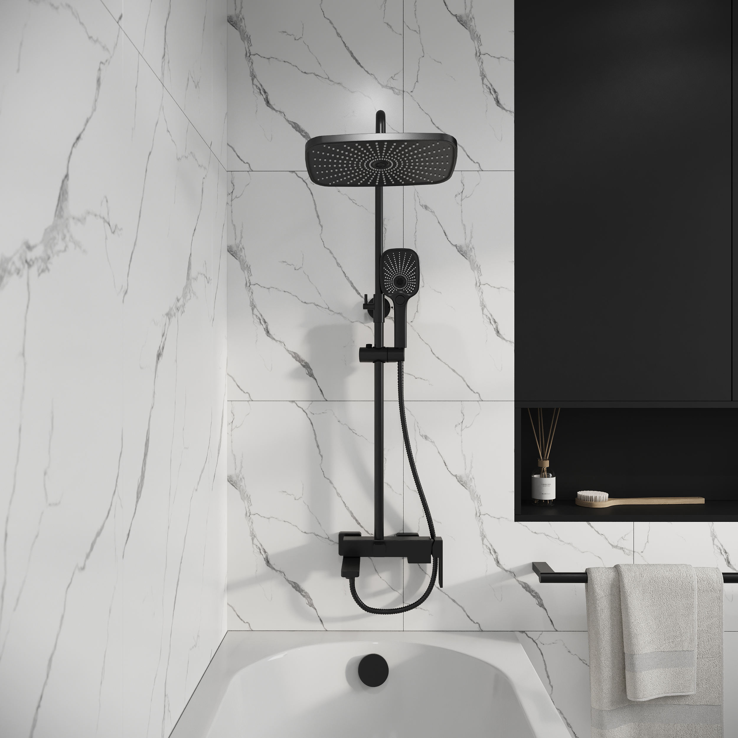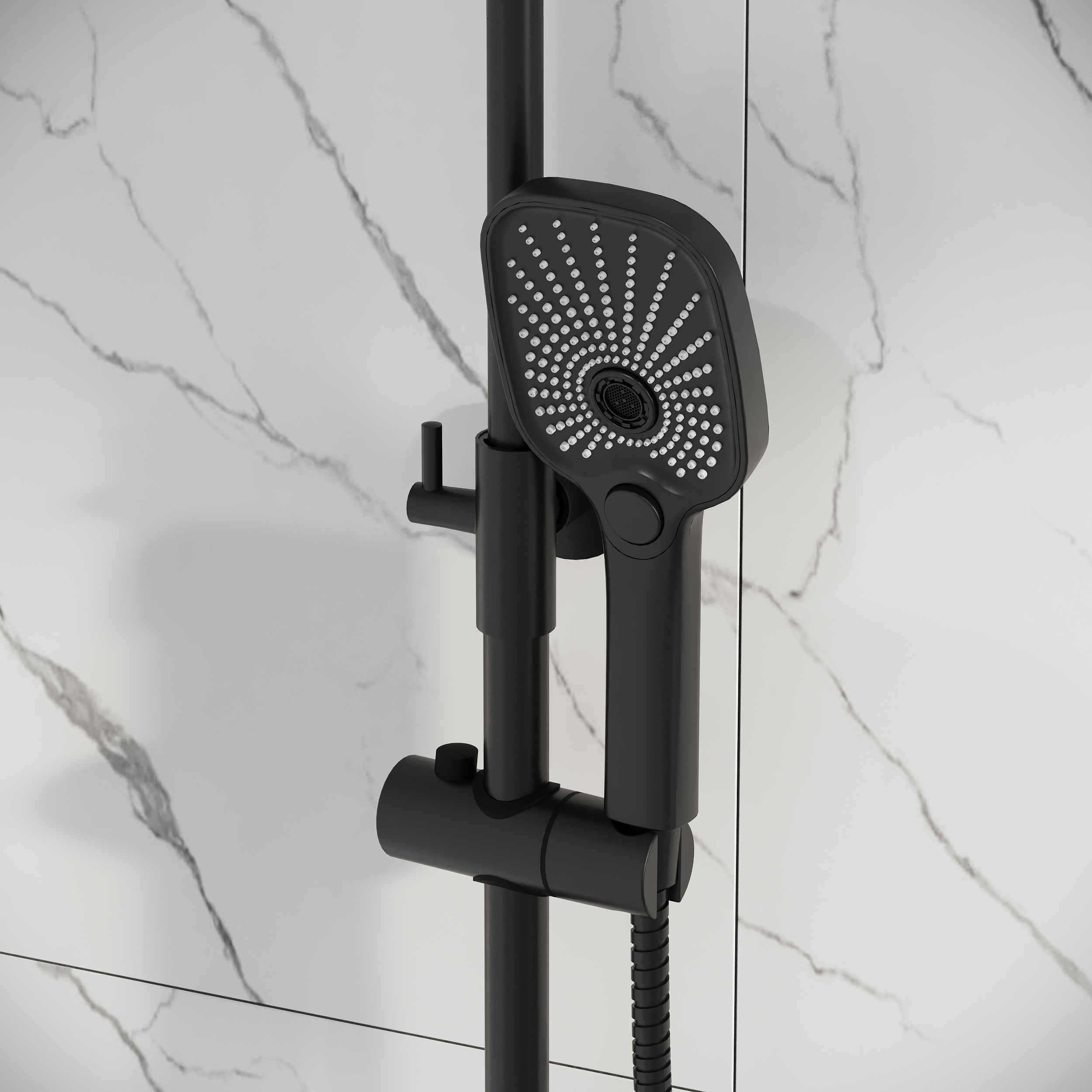 - Телескопическая душевая стойка позволяет изменять высоту до 165 см, что делает использование комфортным для людей разного роста