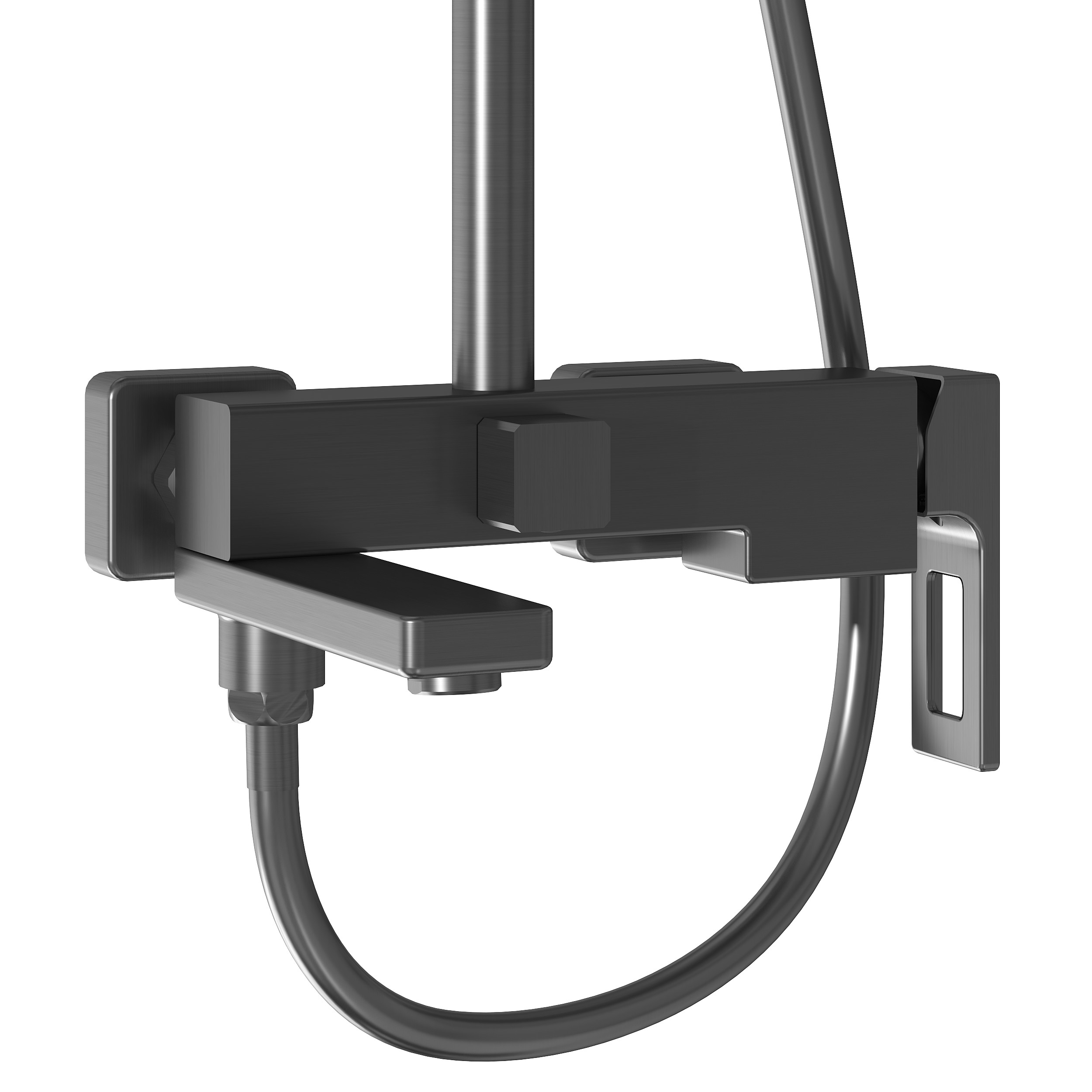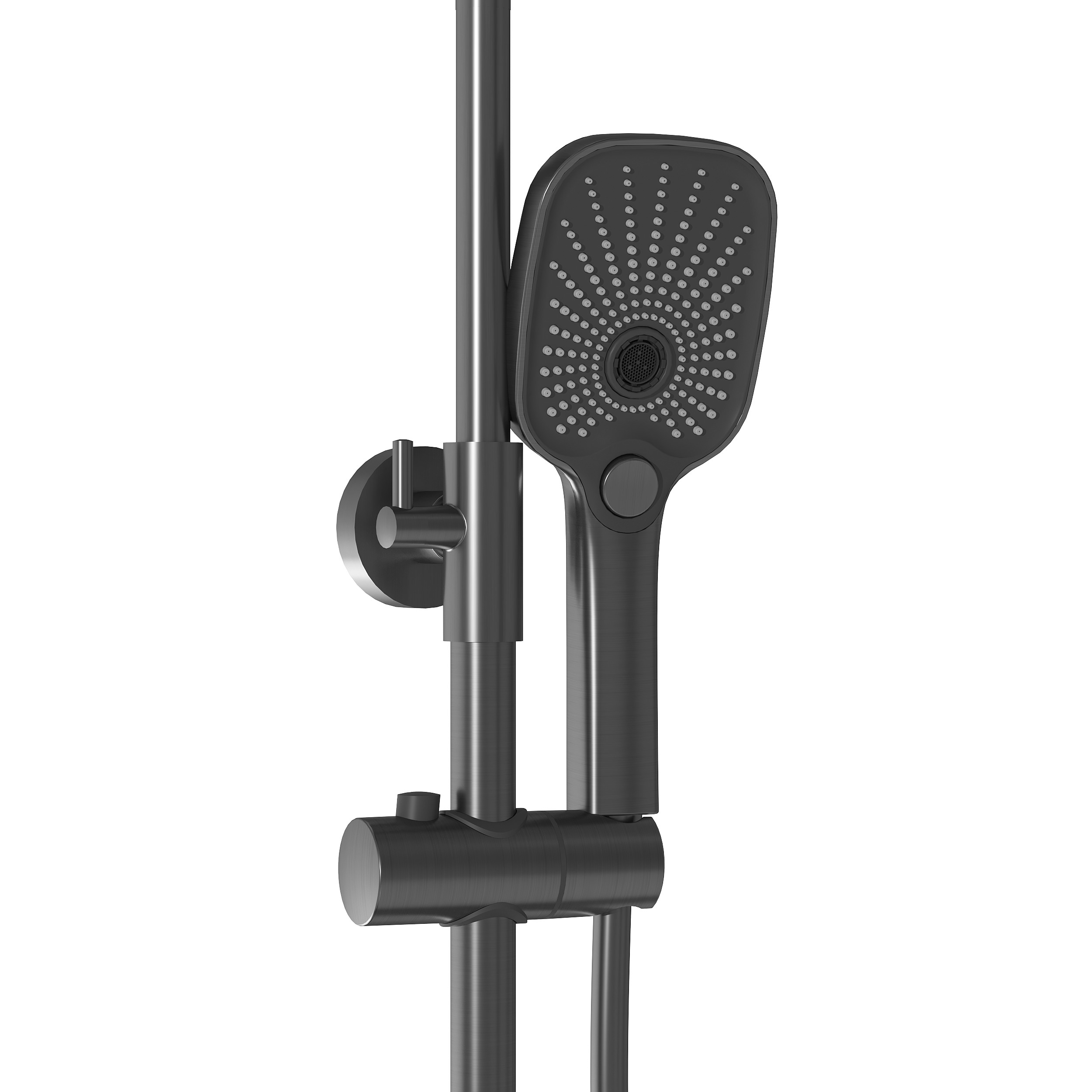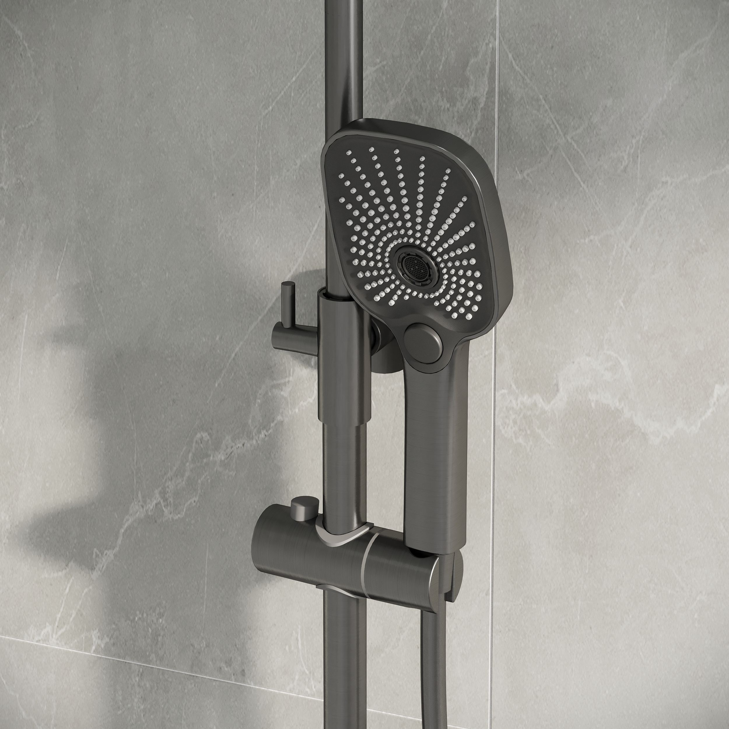 - Телескопическая душевая стойка позволяет изменять высоту до 165 см, что делает использование комфортным для людей разного роста