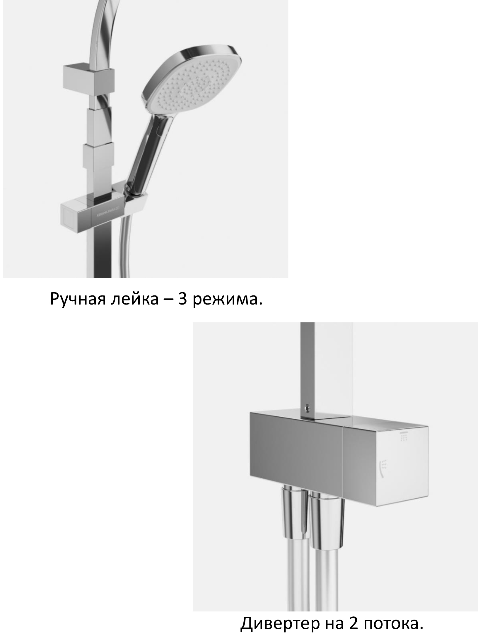 - Стойка – нержавеющая сталь, дивертер – латунь. Лейки – абс пластик.