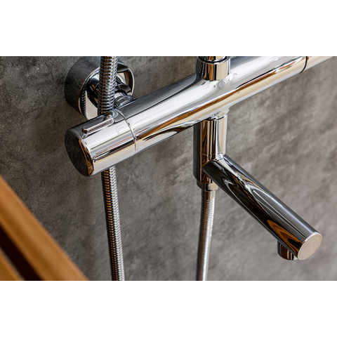 Кроме несомненно стильного и необычного дизайна, смеситель оборудован встроенным термостатом, который будет поддерживать температуру и напор воды на протяжении всего купания. Принцип работы прост: термостат смешивает горячую и холодную воду для получения необходимой температуры, а в случае изменения потока поступающей воды - изменит пропорции смешивания. Кстати, подача воды автоматически прекратится, если горячий или холодный поток перестанет поступать.