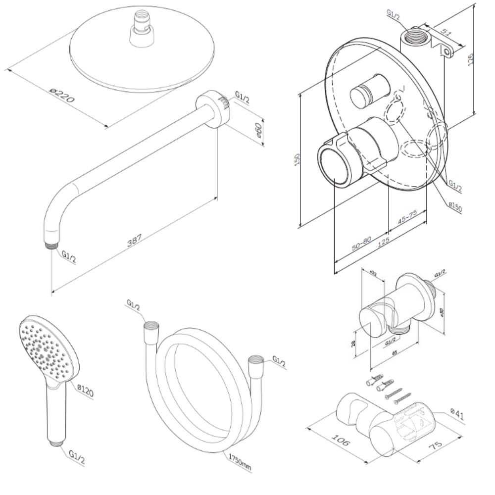 | Оснащение | душевой шланг, переключатель потоков, душевая лейка, кронштейн для верхнего душа |