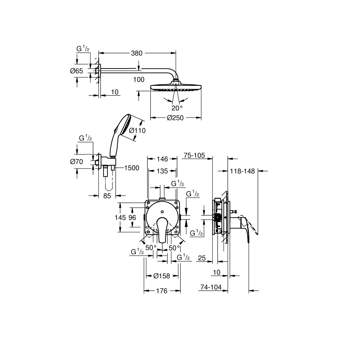 Верхний душ 250 мм с 380-миллиметровым кронштейном обеспечивает успокаивающую струю Rain, но не забывайте о 110-миллиметровом ручном душе. Он имеет два великолепных варианта струи с помощью инновационного переключателя — мощная струя Jet, которая идеально подходит для мытья волос, и струя Rain, которая нежна, как летний дождь. Ручной душ оснащен силиконовым кольцом, которое защищает от повреждений при падении. Он также поставляется с держателем с выпускным отверстием для душа и шлангом длиной 1500 мм.