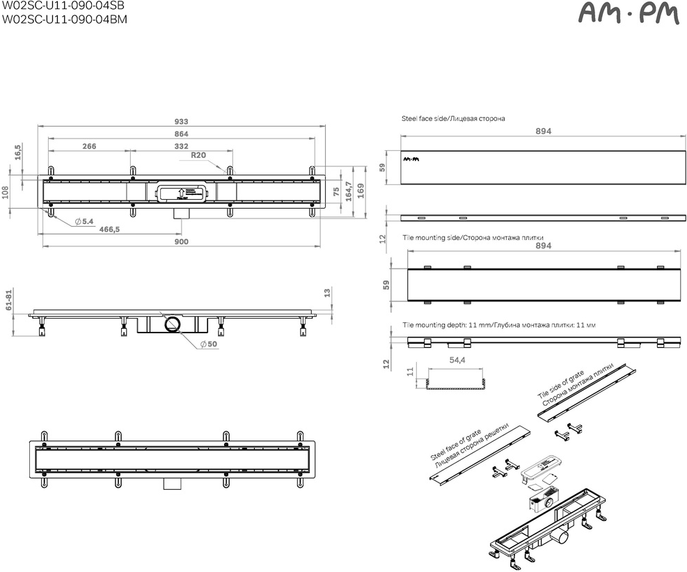 | Вид решетки | с местом под плитку, с щелью для воды |