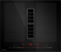 - Четыре независимые варочные зоны расположены на черном закаленном стекле. В центре находится элегантная и прочная решетка, которая скрывает мощную зону вытяжки.
