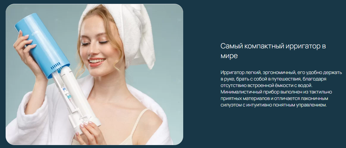 - Самый компактный ирригатор в мире. Ирригатор легкий, эргономичный, его удобно держать в руке, брать с собой в путешествия, благодаря отсутствию встроенной ёмкости с водой. Минималистичный прибор выполнен из тактильно приятных материалов и отличается лаконичным силуэтом с интуитивно понятным управлением.