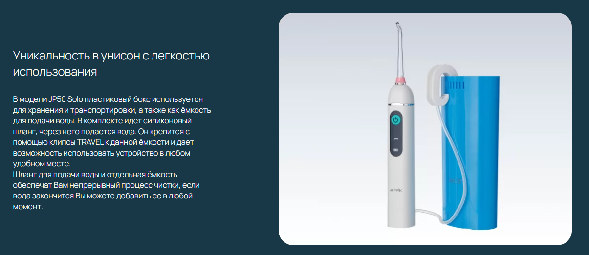 - Уникальность в унисон с легкостью использования. В модели JP50 Solo пластиковый бокс используется для хранения и транспортировки, а также как ёмкость для подачи воды. В комплекте идёт силиконовый шланг, через него подается вода. Он крепится с помощью клипсы TRAVEL к данной ёмкости и дает возможность использовать устройство в любом удобном месте. Шланг для подачи воды и отдельная ёмкость обеспечат Вам непрерывный процесс чистки, если вода закончится Вы можете добавить ее в любой момент.