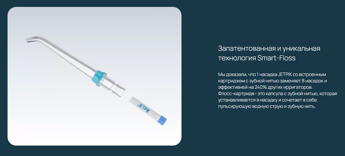 - Запатентованная и уникальная технология Smart-Floss. Мы доказали, что 1 насадка JETPIK со встроенным картриджем с зубной нитью заменяет 8 насадок и эффективней на 240% других ирригаторов. Флосс-картридж- это капсула с зубной нитью, которая устанавливается в насадку и сочетает в себе пульсирующую водную струю и зубную нить.