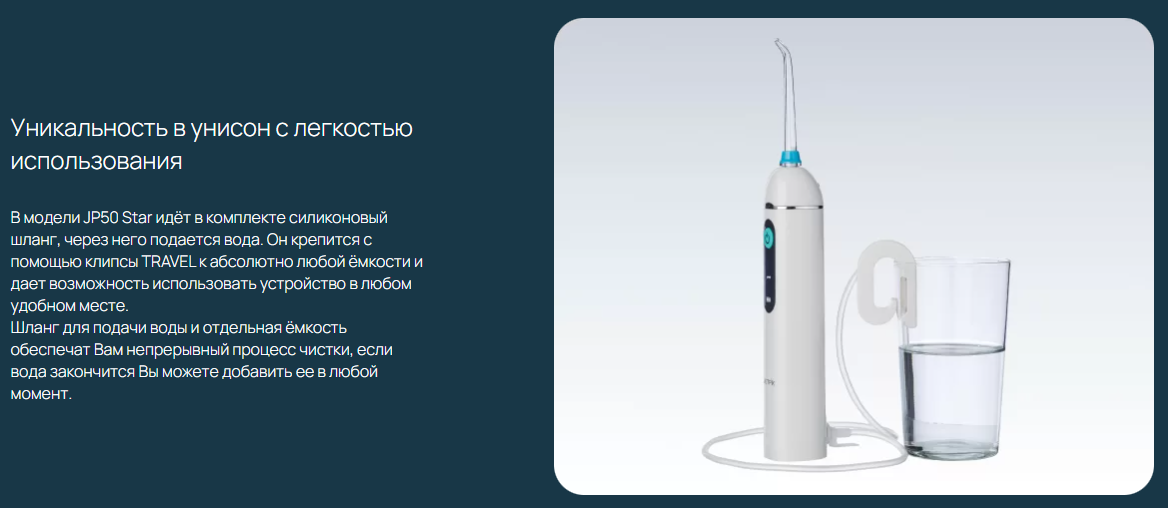 - Уникальность в унисон с легкостью использования. В модели JP50 Star идёт в комплекте силиконовый шланг, через него подается вода. Он крепится с помощью клипсы TRAVEL к абсолютно любой ёмкости и дает возможность использовать устройство в любом удобном месте. Шланг для подачи воды и отдельная ёмкость обеспечат Вам непрерывный процесс чистки, если вода закончится Вы можете добавить ее в любой момент.