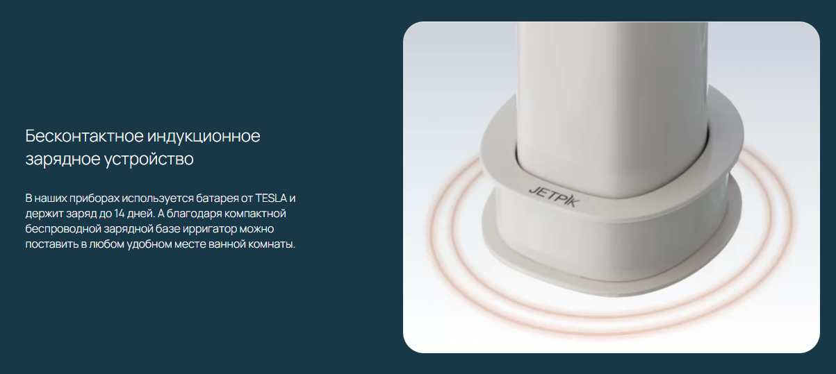- Бесконтактное индукционное зарядное устройство. В наших приборах используется батарея от TESLA и держит заряд до 14 дней. А благодаря компактной беспроводной зарядной базе ирригатор можно поставить в любом удобном месте ванной комнаты.