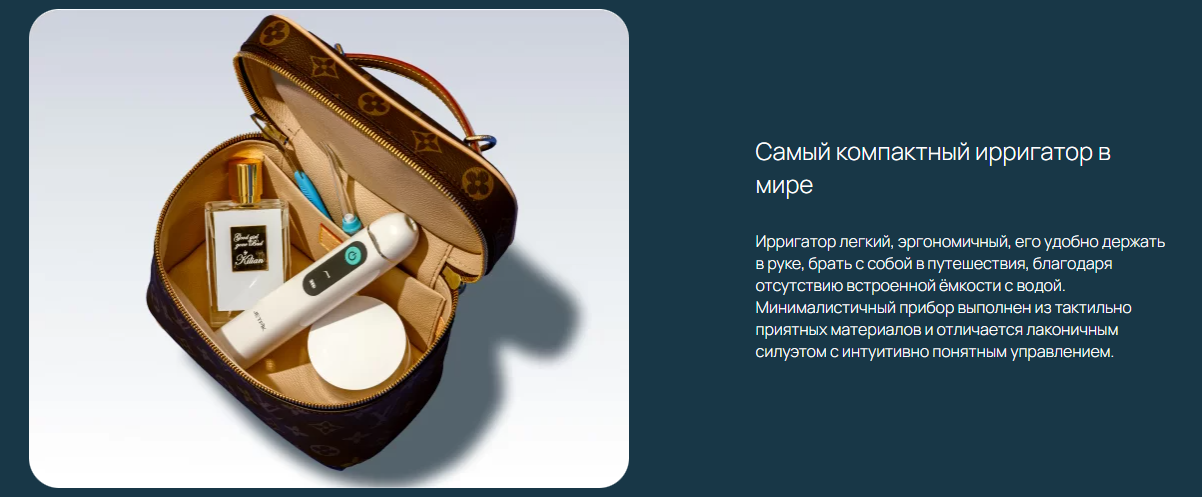 - Самый компактный ирригатор в мире. Ирригатор легкий, эргономичный, его удобно держать в руке, брать с собой в путешествия, благодаря отсутствию встроенной ёмкости с водой. Минималистичный прибор выполнен из тактильно приятных материалов и отличается лаконичным силуэтом с интуитивно понятным управлением.