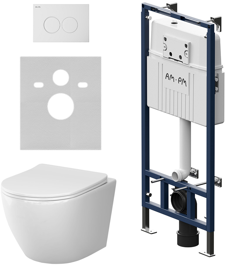 - Полностью готовый к установке комплект: система инсталляции с клавишей, подвесной унитаз с сиденьем, включающий все необходимые крепления, патрубки, звукоизолирующую прокладку