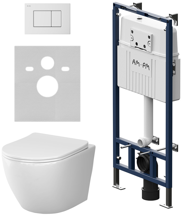 - Полностью готовый к установке комплект: система инсталляции с клавишей, подвесной унитаз с сиденьем, включающий все необходимые крепления, патрубки, звукоизолирующую прокладку