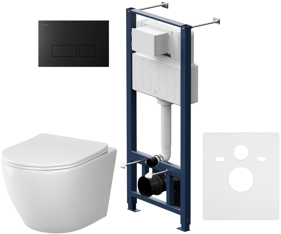 - Полностью готовый к установке комплект: система инсталляции с клавишей, подвесной унитаз с сиденьем, включающий все необходимые крепления, патрубки, звукоизолирующую прокладку