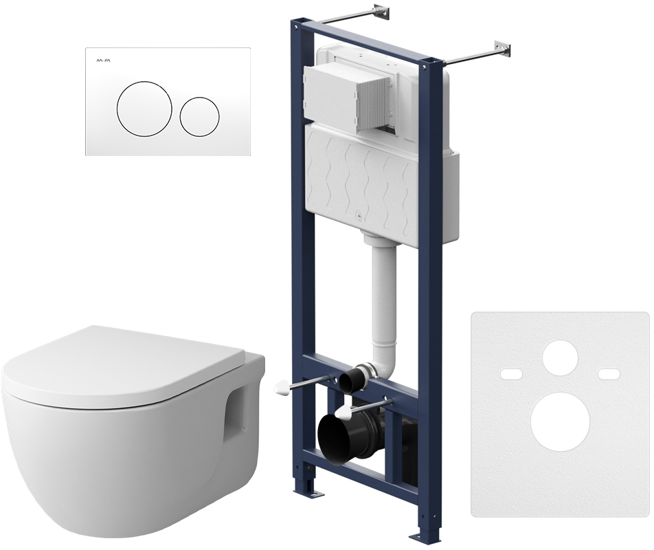 Полностью готовый к установке комплект: система инсталляции с клавишей, подвесной унитаз с сиденьем. Неразборная рама из стального профиля выдерживает нагрузку до 400 кг. Полностью изолированный бачок с качественной двухрежимной смывной арматурой укомплектован пневматической клавишей в цвете белый. В комплекте все необходимые патрубки и крепления, а также прокладка между унитазом и стеной - звукоизоляция.