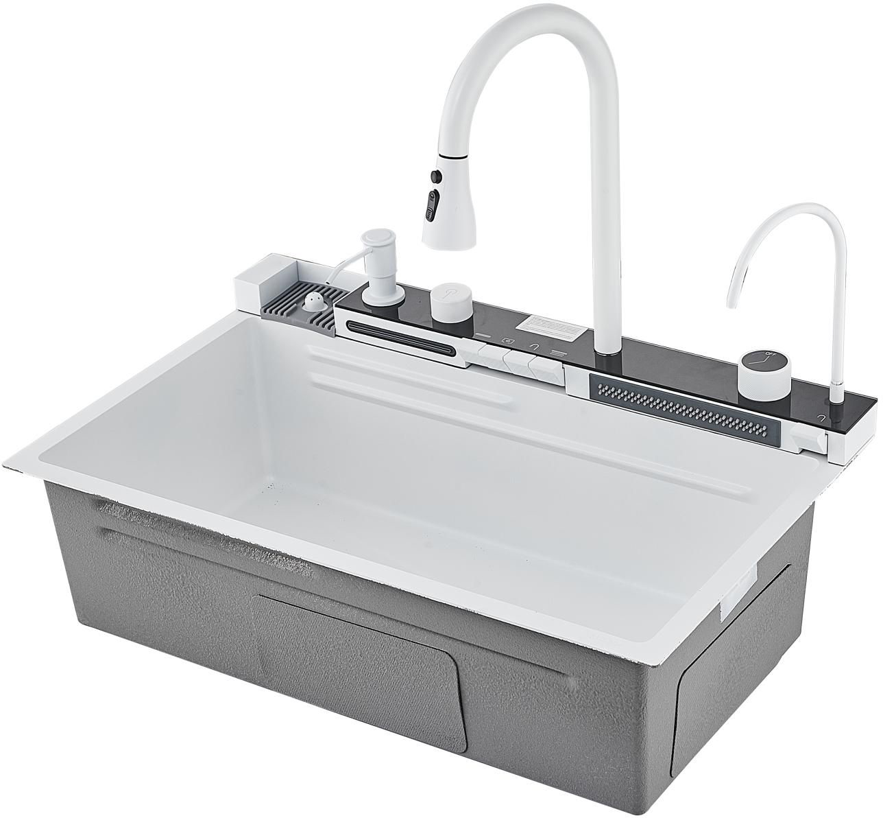 - Смеситель оборудован выдвижной лейкой, гибким шлангом, функцией водопада и дисплеем, на котором отображена температура воды и время работы смесителя. Он украсит вашу кухню и облегчит процесс работы. Смеситель имеет 4 варианта подачи воды (классическая струя, под давлением, сеточка и водопад). Управление подачи воды из водопада и из излива смесителя осуществляется с помощью двух клавиш на панели изделия. С их помощью можно регулировать напор воды. Температура регулируется поворотной шайбой, расположенной справа от смесителя.