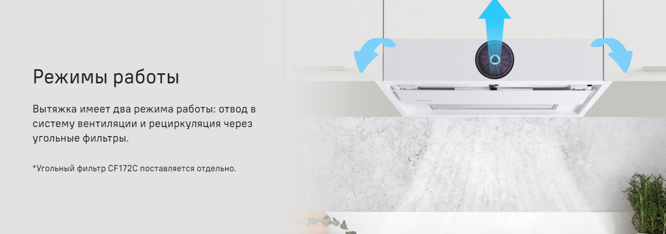 - Работает в двух режимах – отвода (при подключении к системе вентиляции) и рециркуляции (при использовании сменного угольного фильтра).