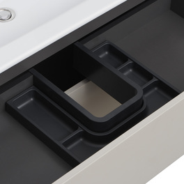 - Верхний и нижний ящики оснащены системой организации пространства, которая позволяет содержать косметические средства в идеальном порядке