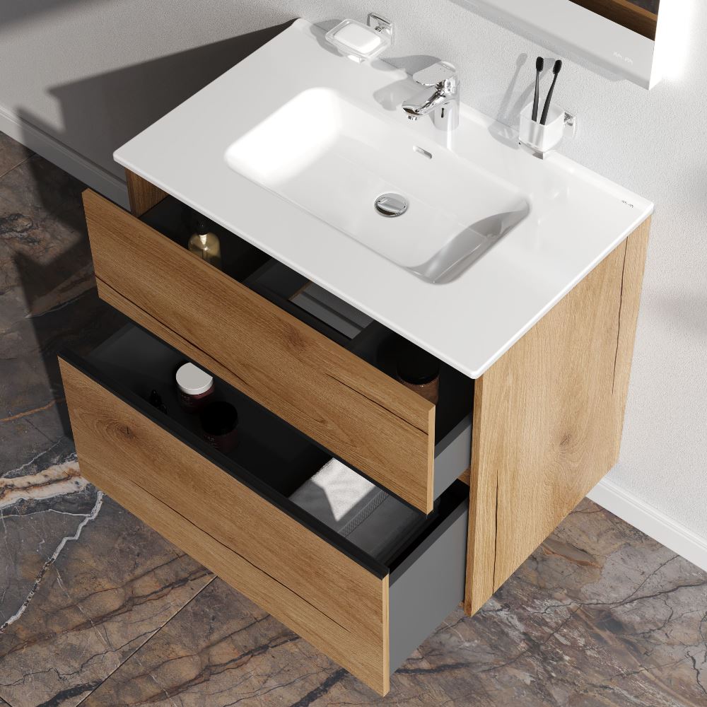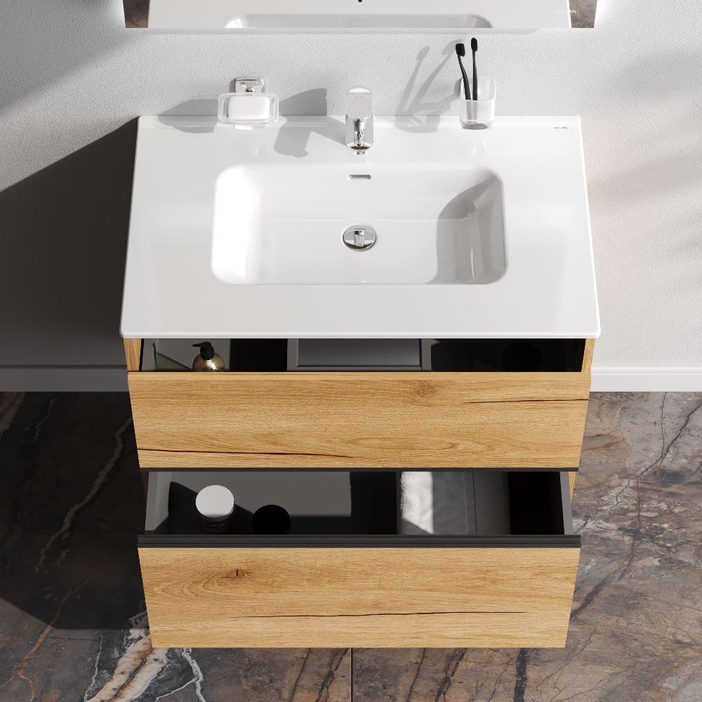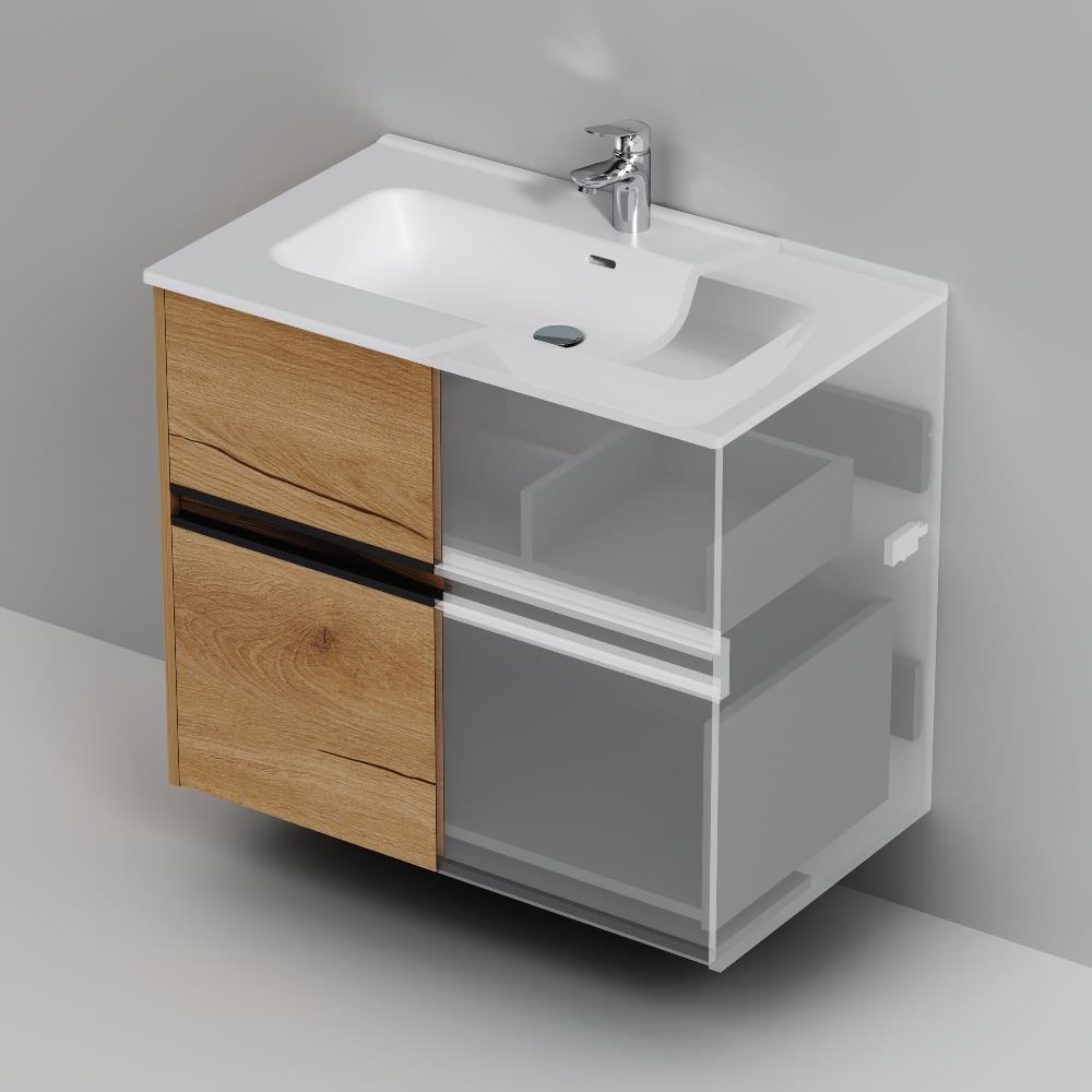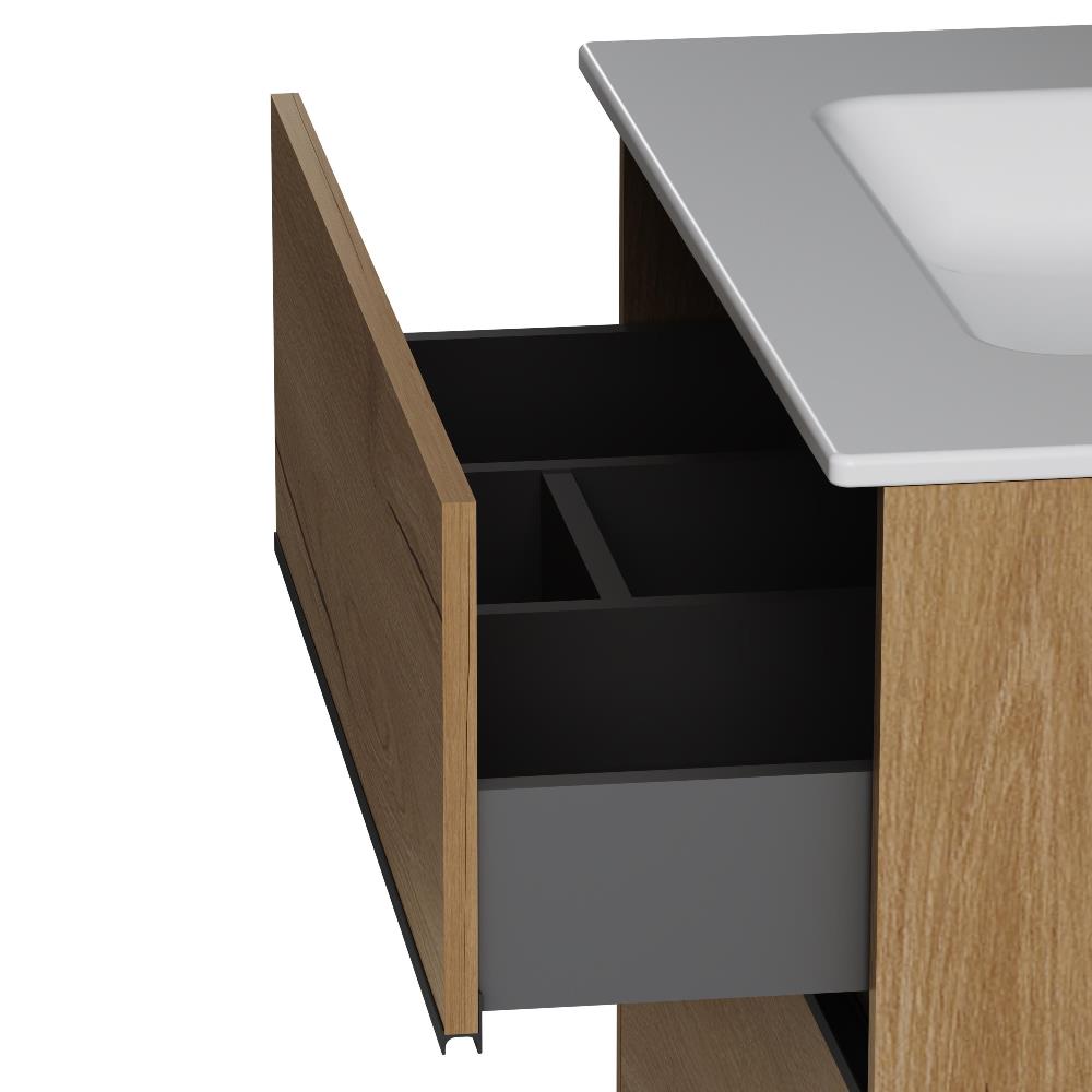 - Два вместительных ящика на направляющих Soft-close скрытого монтажа, которые обеспечивают плавное и бесшумное открывание и закрывание - использование тумбы максимально комфортное.