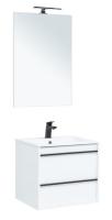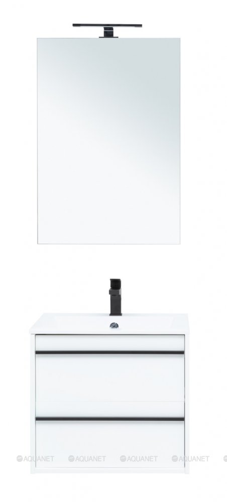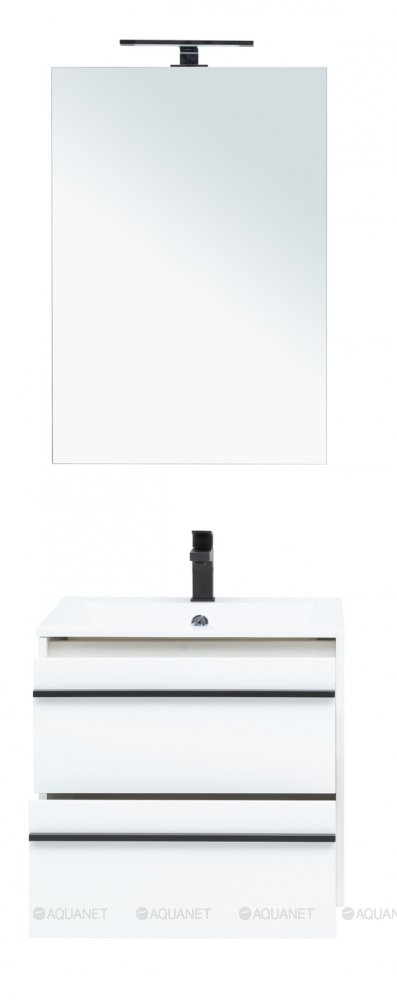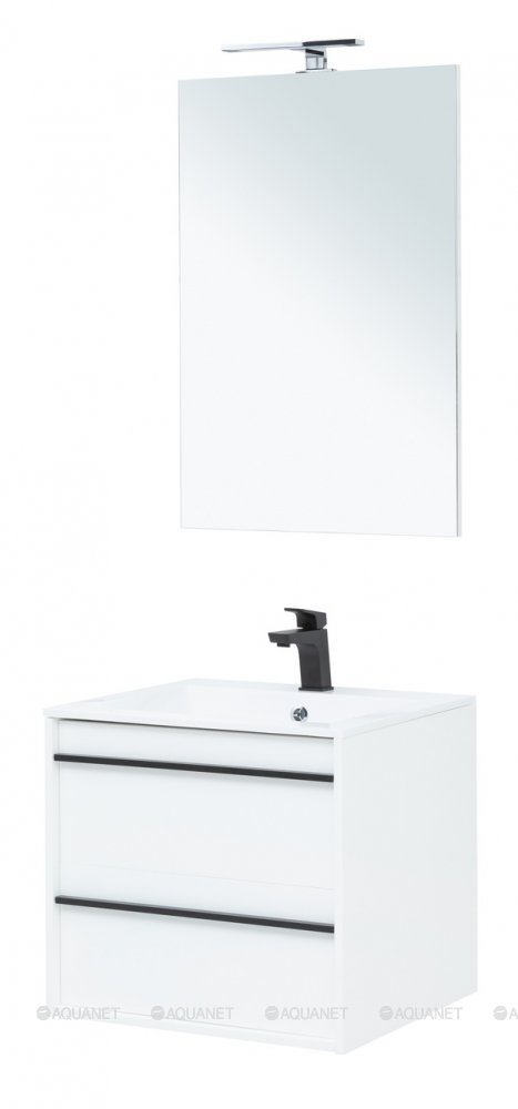 В комплекте тумба с очень удобной зоной хранения: два выдвижных ящика, оборудованных доводчиками, словно утоплены внутрь корпуса. Тонкие изящные ручки во всю ширину ящиков. Именно они находятся в одной плоскости с боковыми стенками. Выглядит стильно. К тому же, безопасно, так как нет выступающих деталей. Кстати, ручки отечественного производства. Сделаны из алюминия, чтобы исключить возможность коррозии, по заказу Aquanet специально для этой коллекции. Сверху на них нанесено эмалевое покрытие. Сверху – раковина «Электра» из литьевого мрамора. У нее максимально глубокая и объемная чаша, но все внутренние детали скруглены. Корпус и фасады тумбы шириной 60 см – из влагостойкого ЛДСП. В комплекте зеркало, выполненное в современном дизайне, простое по форме и качественное по исполнению.