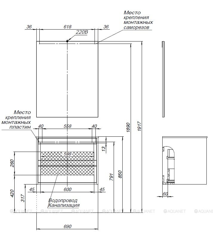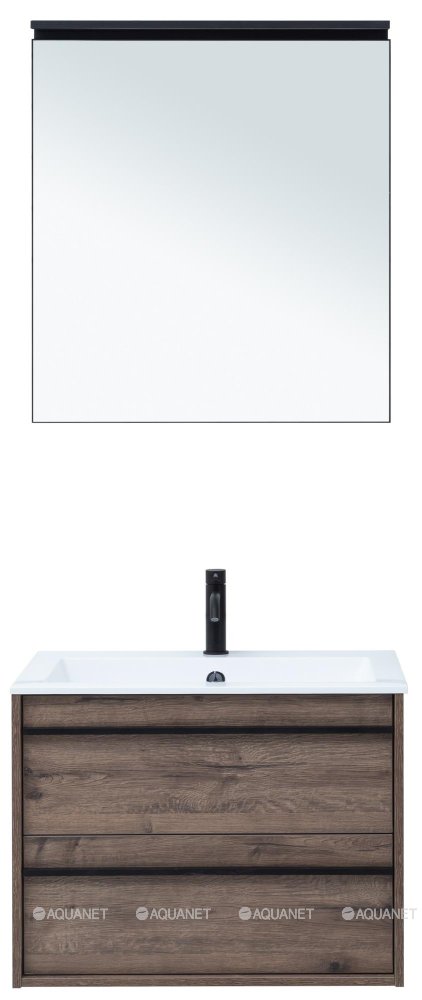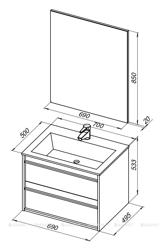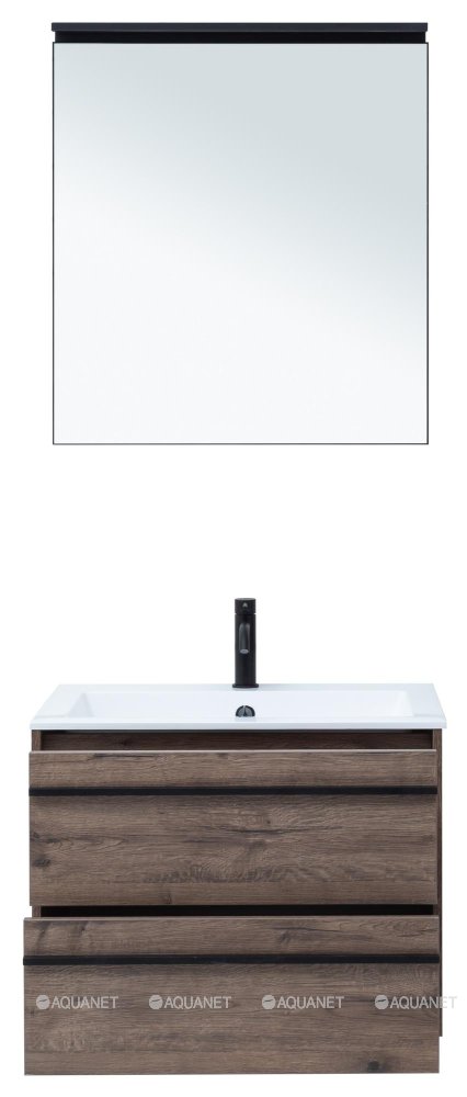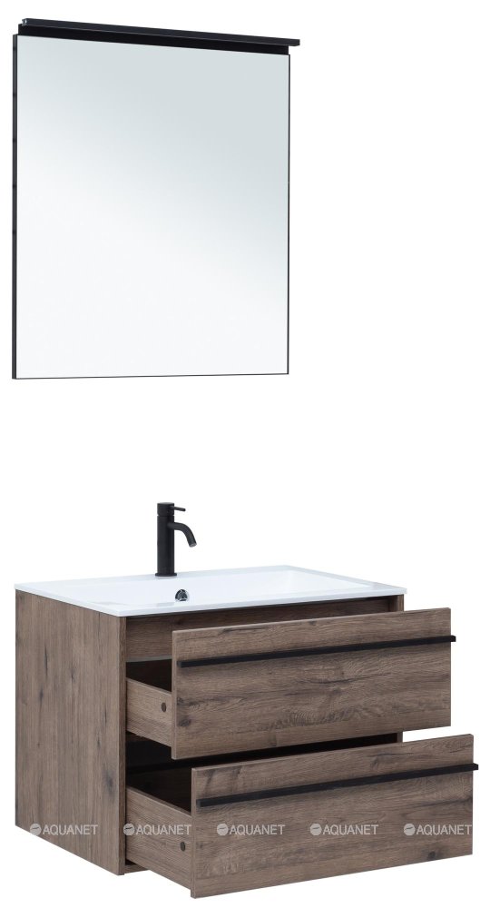 В комплекте тумба с очень удобной зоной хранения: два выдвижных ящика, оборудованных доводчиками, словно утоплены внутрь корпуса. Тонкие изящные ручки во всю ширину ящиков. Именно они находятся в одной плоскости с боковыми стенками. Выглядит стильно. К тому же, безопасно, так как нет выступающих деталей. Кстати, ручки отечественного производства. Сделаны из алюминия, чтобы исключить возможность коррозии, по заказу Aquanet специально для этой коллекции. Сверху на них нанесено эмалевое покрытие. Сверху – раковина «Электра» из литьевого мрамора. У нее максимально глубокая и объемная чаша, но все внутренние детали скруглены. Корпус и фасады тумбы шириной 70 см – из влагостойкого ЛДСП. В комплекте зеркало, выполненное в современном дизайне, простое по форме и качественное по исполнению.
