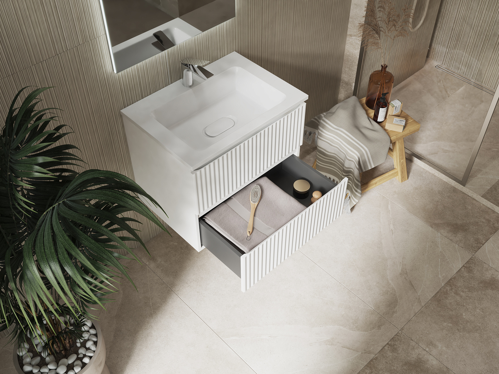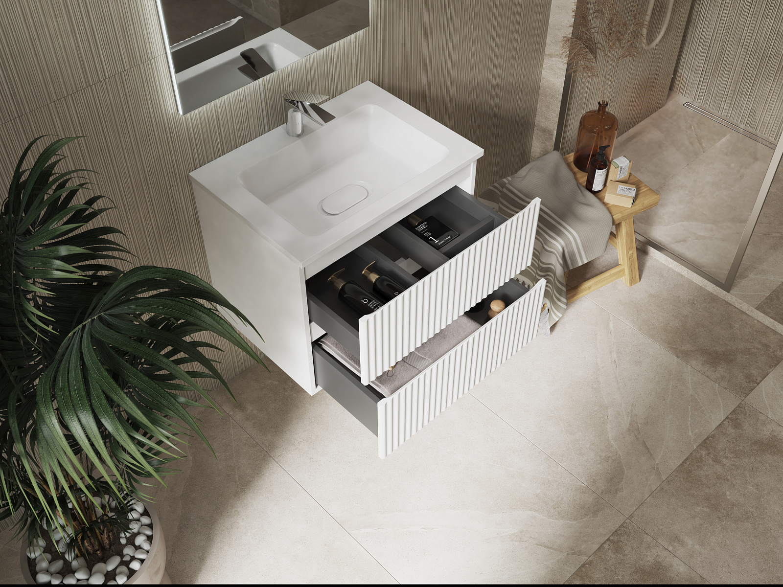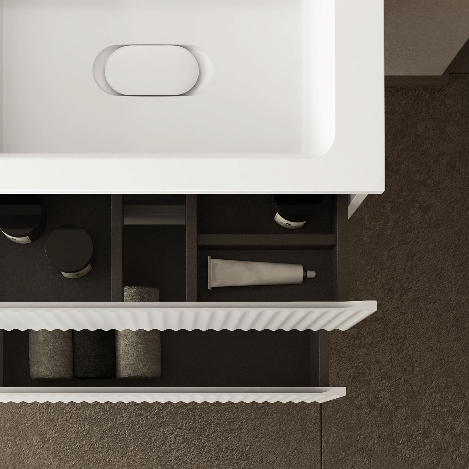 Тумба выполнена из влагостойких материалов с антибактериальным покрытием. Оснащена 2 вместительными ящиками с системой плавного закрывания. Надежная фурнитура выдерживает до 80 000 циклов работы.
