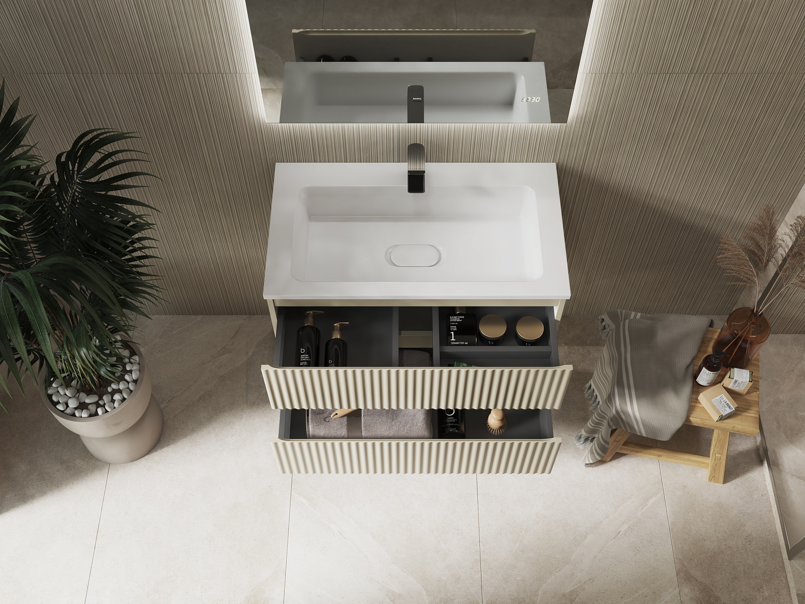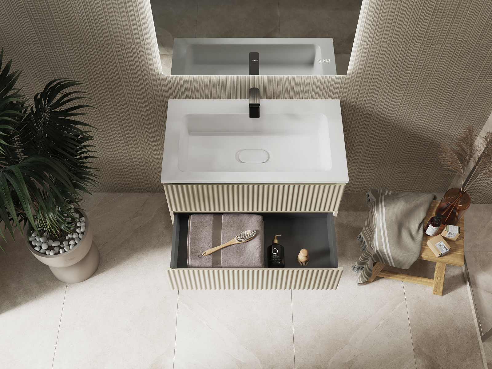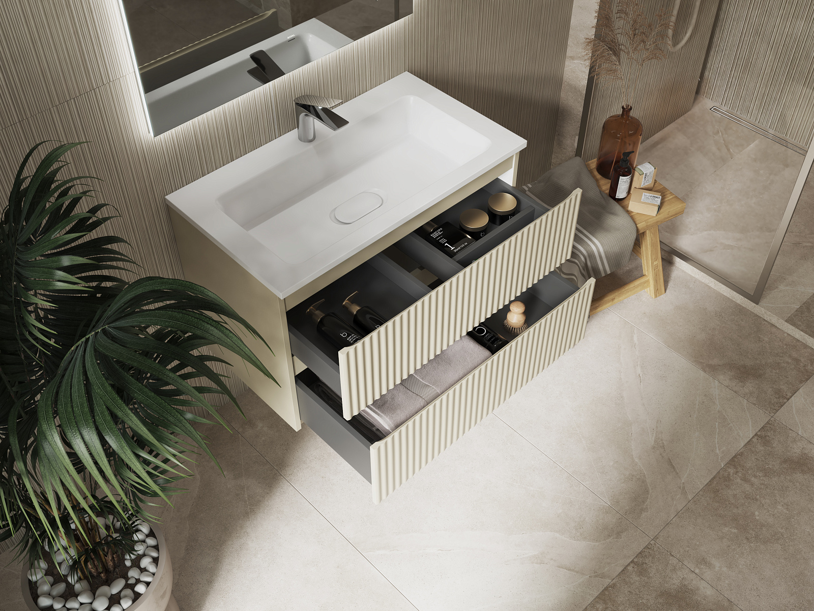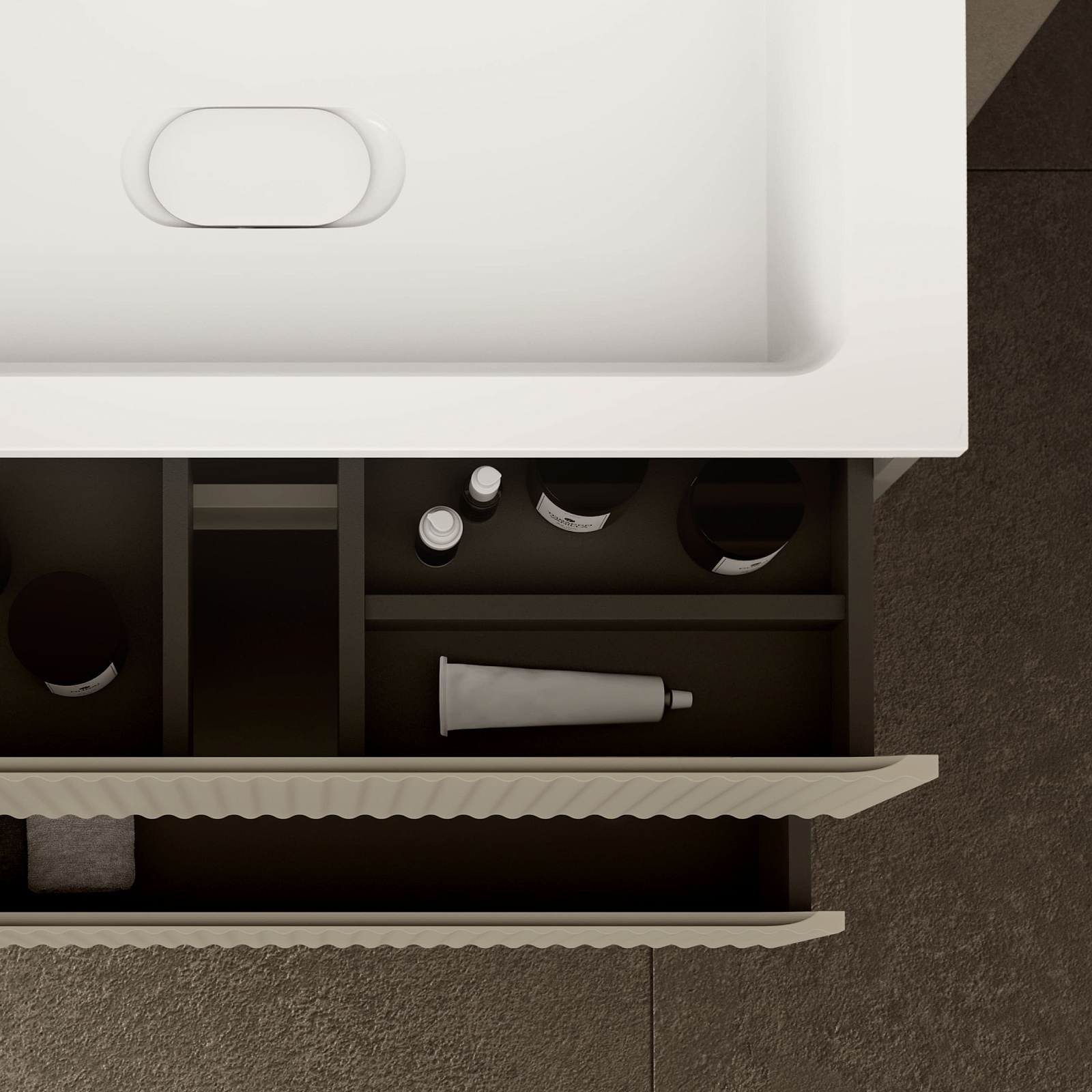 Тумба выполнена из влагостойких материалов с антибактериальным покрытием. Оснащена 2 вместительными ящиками с системой плавного закрывания. Надежная фурнитура выдерживает до 80 000 циклов работы.