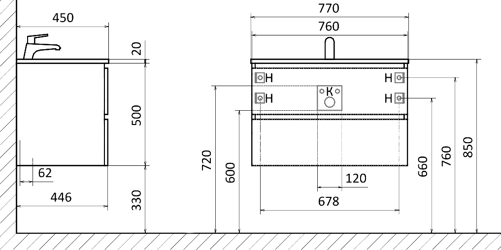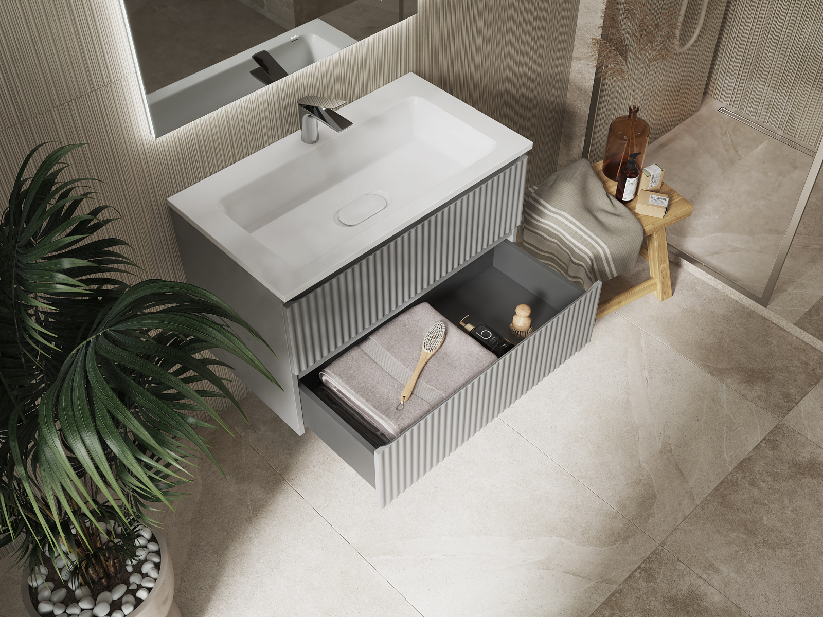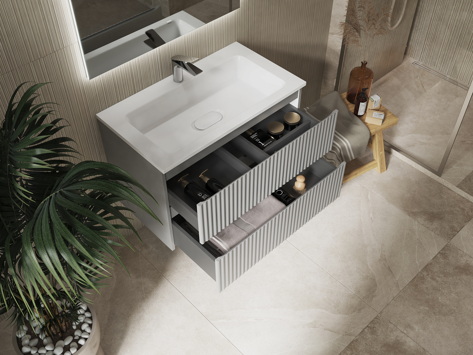 Тумба выполнена из влагостойких материалов с антибактериальным покрытием. Оснащена 2 вместительными ящиками с системой плавного закрывания. Надежная фурнитура выдерживает до 80 000 циклов работы.
