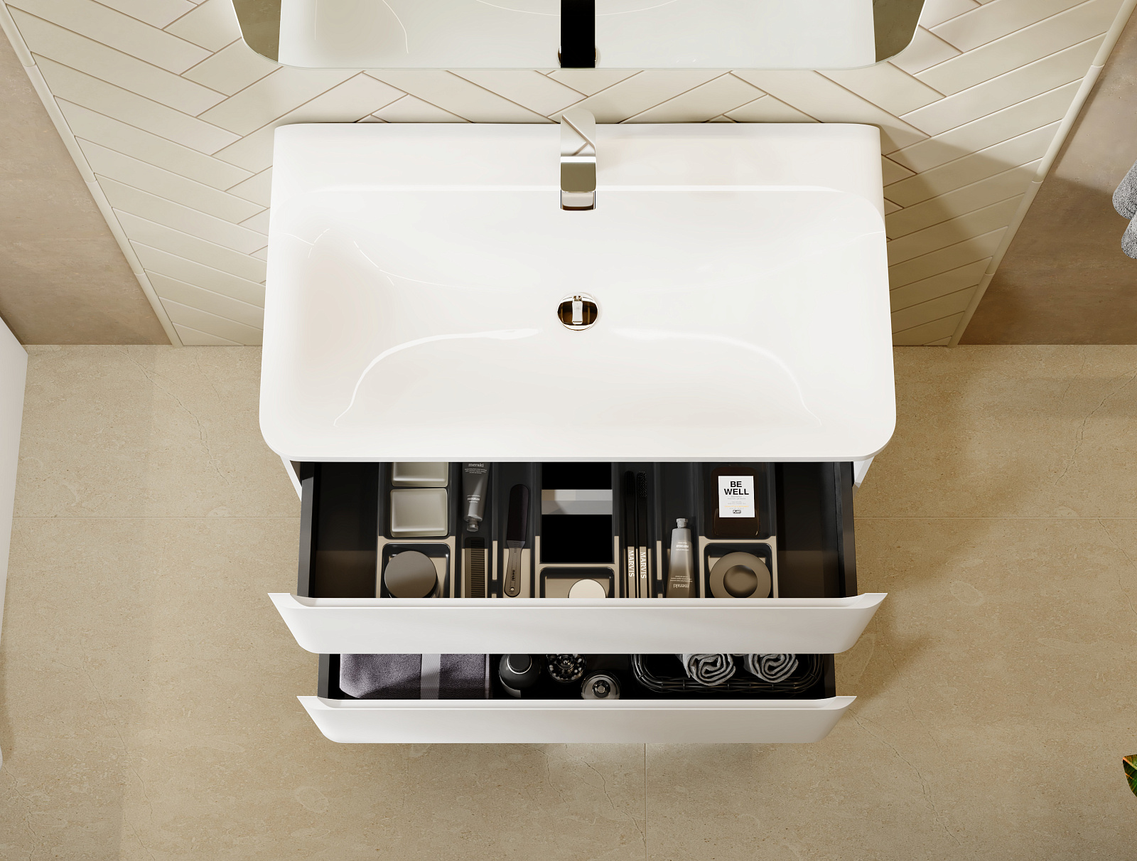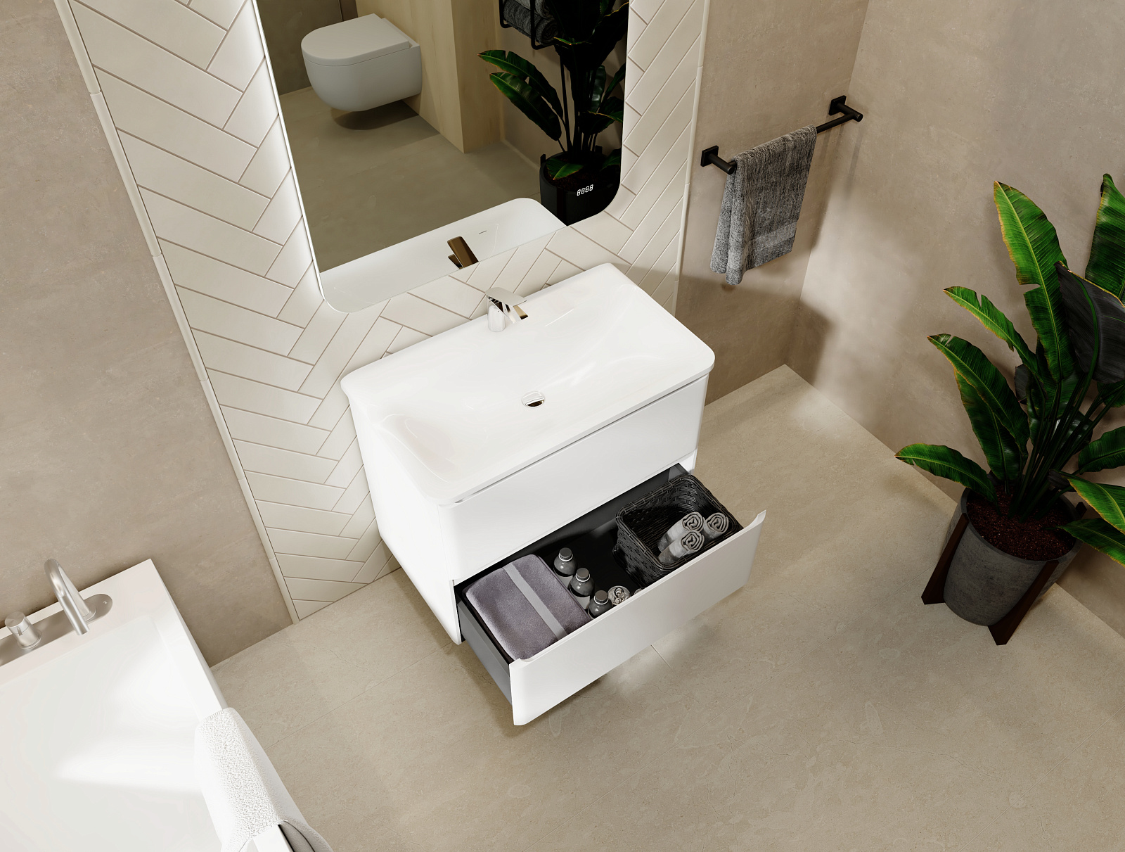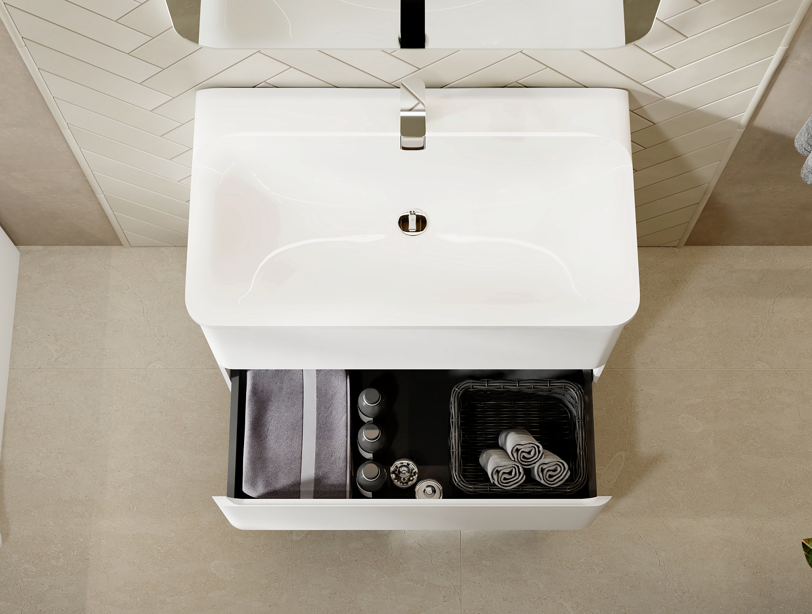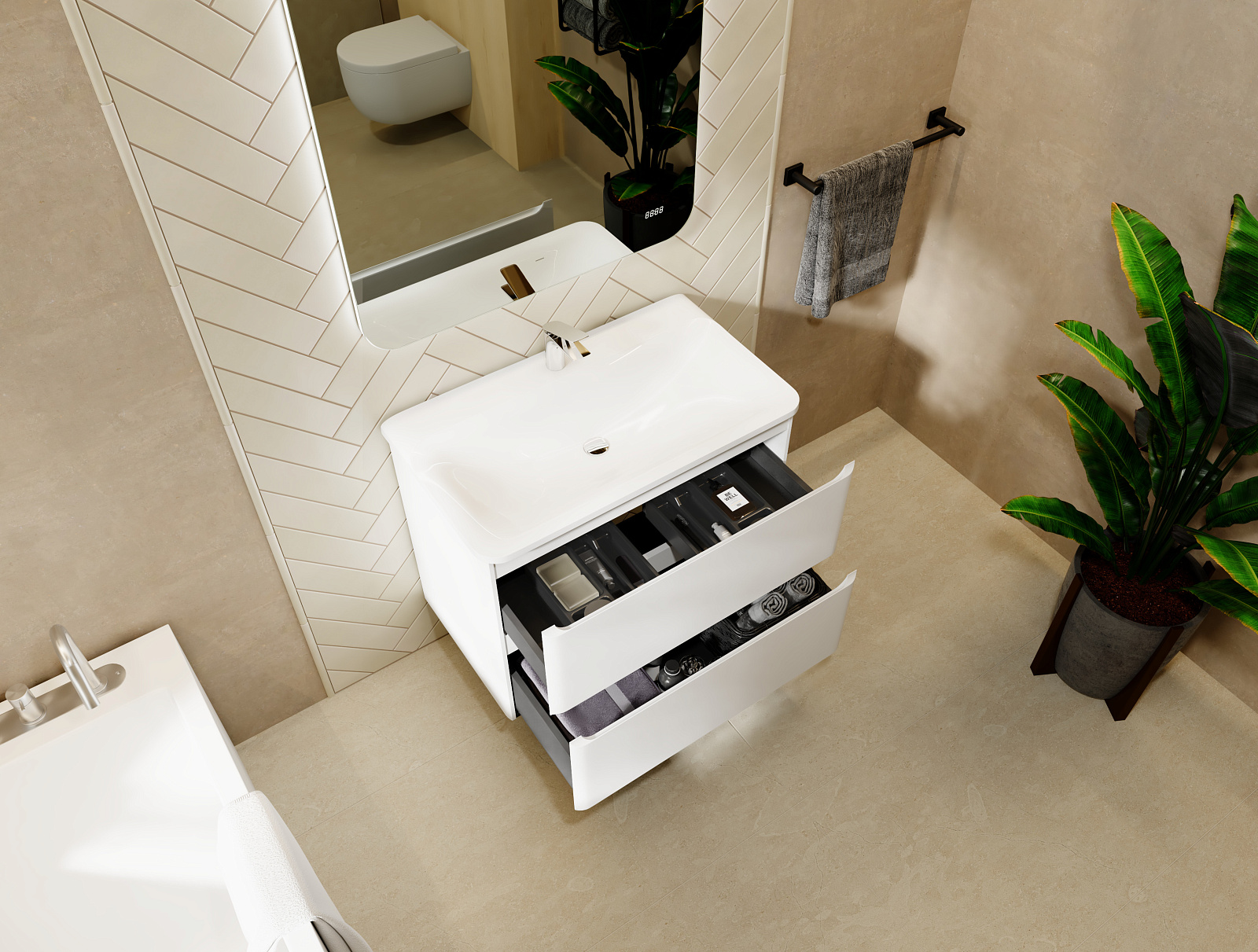 Коллекция Welto разработана в сдержанном современном стиле. Компактный выдвижной ящик освобождает пространство под тумбой для дополнительного использования. Встроенный органайзер помогает удобно разместить все мелкие предметы и поддерживать порядок в ванной комнате. Плавное скругление углов и интегрированные ручки делают комплект мебели максимально безопасным. Полноразмерная вкладная раковина авторского дизайна с пологими бортами проста в уходе. Корпуса и фасады пенала и тумбы изготовлены из МДФ и покрыты глянцевой пленкой ПВХ.