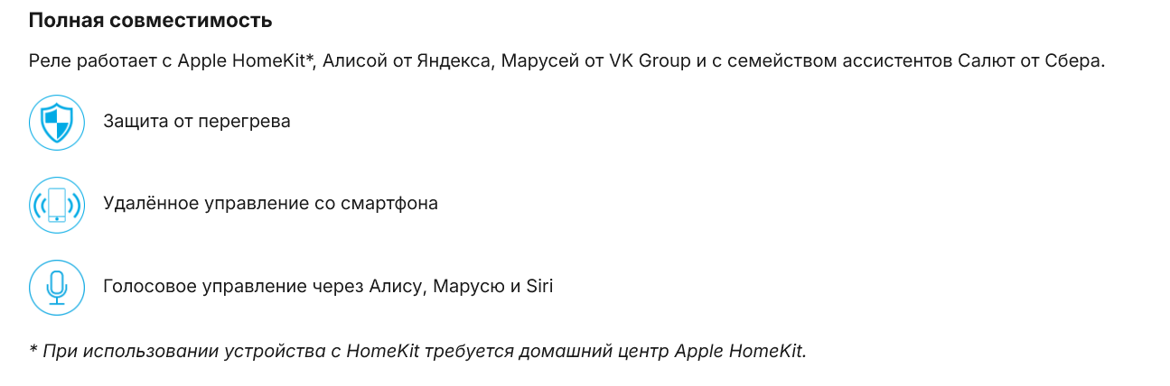 Реле работает с Apple HomeKit*, Алисой от Яндекса, Марусей от VK Group и с семейством ассистентов Салют от Сбера.