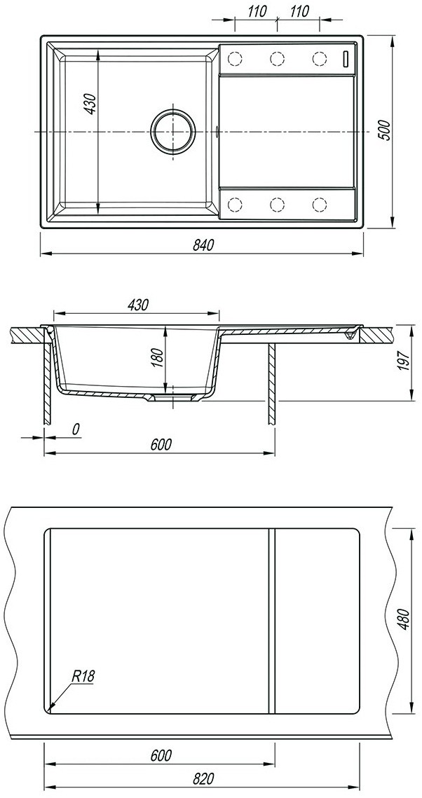 | Отверстия под смеситель | без отверстий, на 1 отверстие, на 2 отверстия, на 3 отверстия |